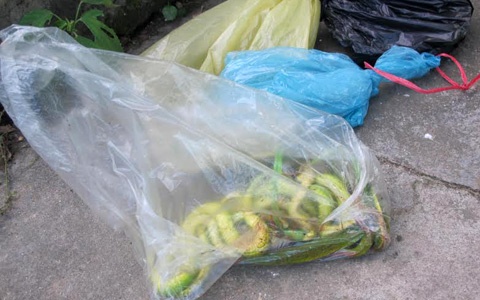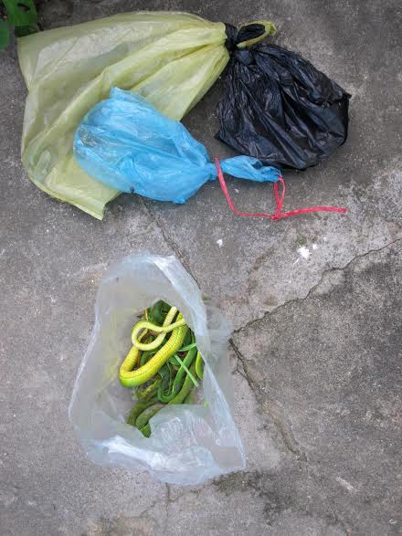 | Lãnh đạo xã đã thông báo trên loa truyền thanh, kêu gọi người dân tham gia diệt rắn lục. Khi phát hiện và giao nộp để xã tiêu hủy sẽ được trả 20 nghìn đồng/1 con. |