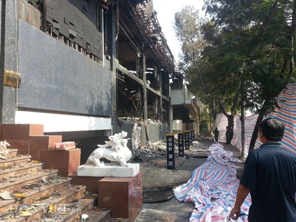 | Quán bar Luxury được xây dựng với kết cấu cơ bản là khung sắt nên khi xảy ra hỏa hoạn, ngọn lửa đã nung nóng các thanh sắt, kéo sập quán bar. |