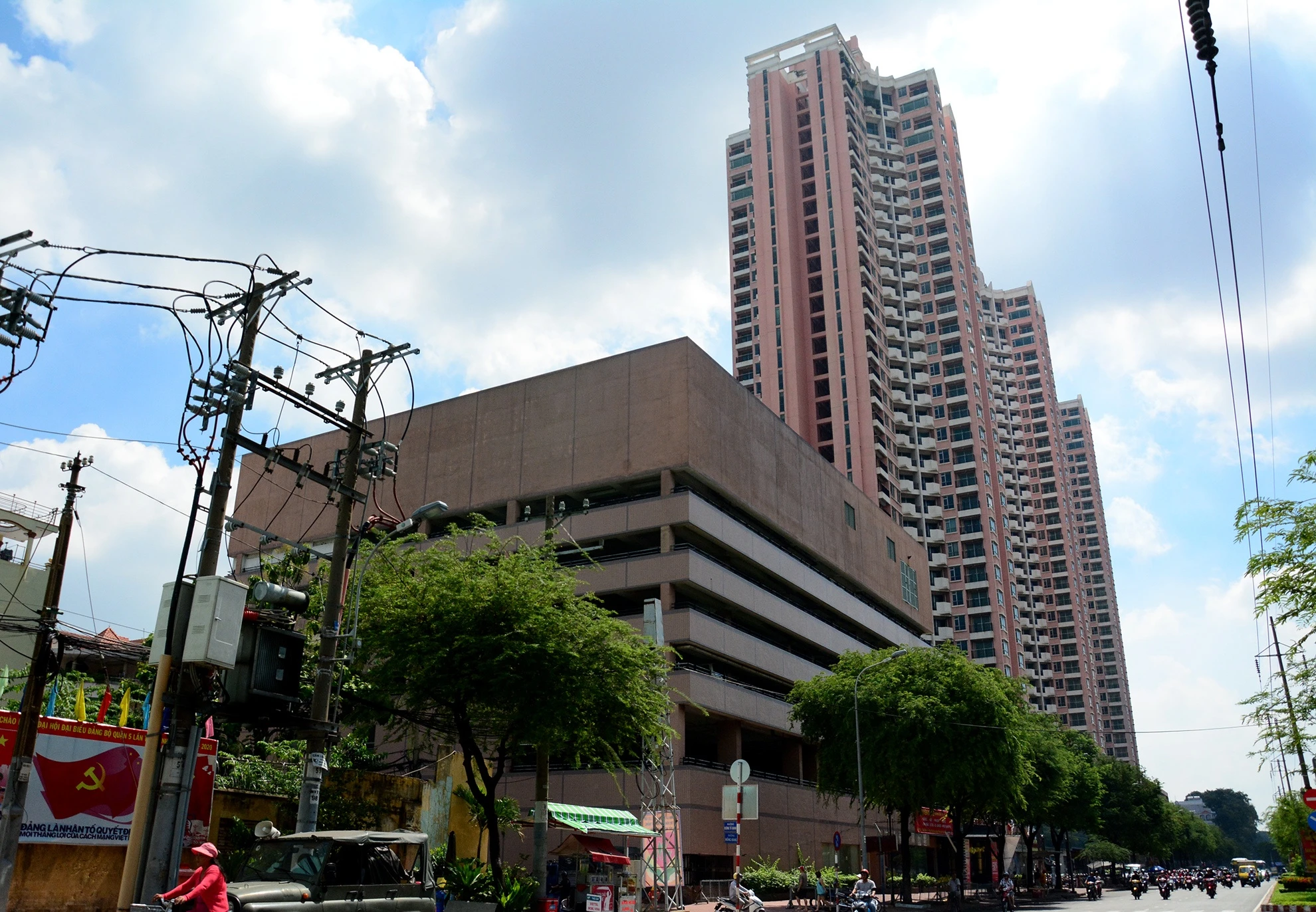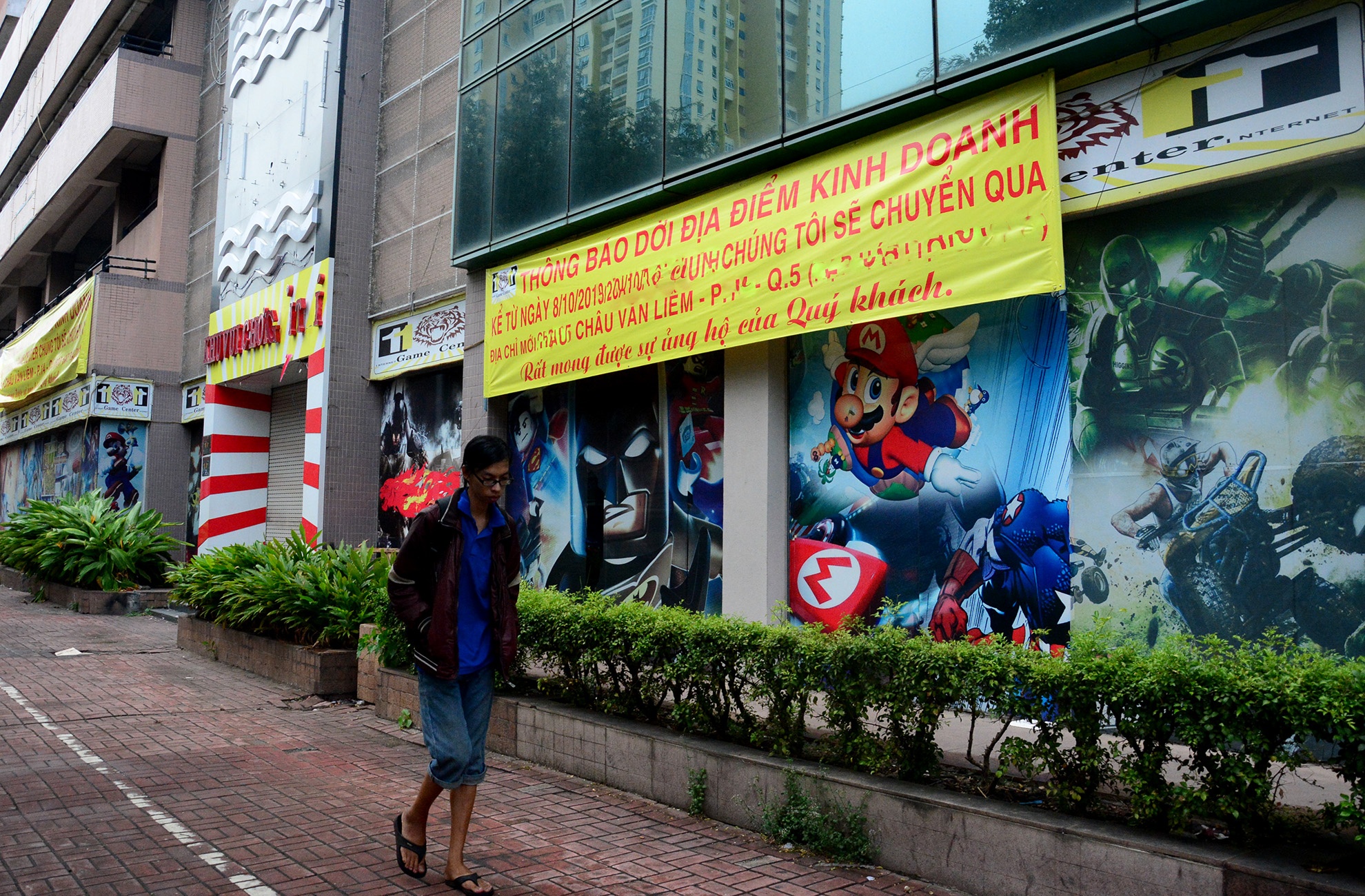 | Nằm trong cụm cao ốc là trung tâm mua sắm, giải trí với 4 tầng. Tuy nhiên, sau một thời gian thời làm ăn kém hiệu quả, các đơn vị kinh doanh tại đây đã dọn đi. Mặt tiền từng chi chít pano nay còn lại duy nhất tấm bảng "cho thuê quảng cáo". |