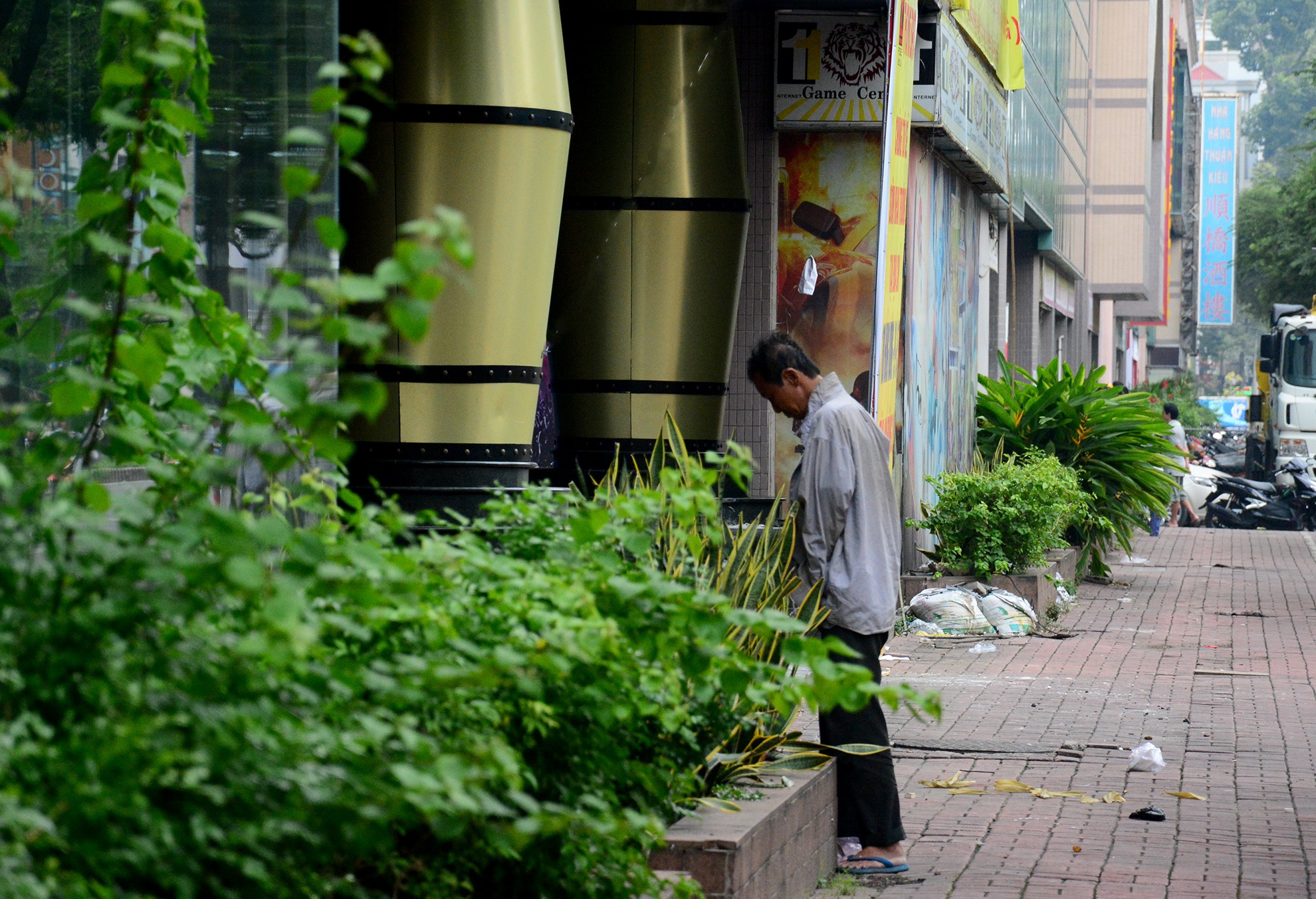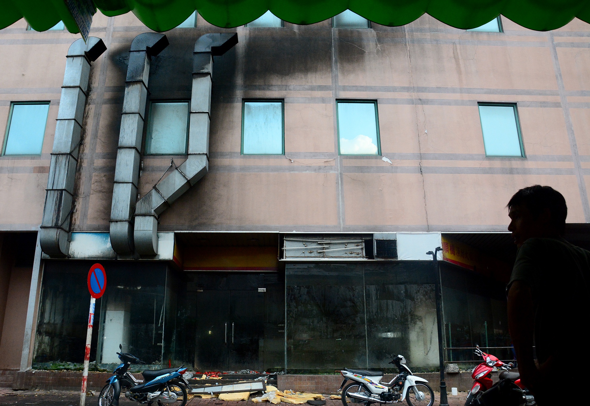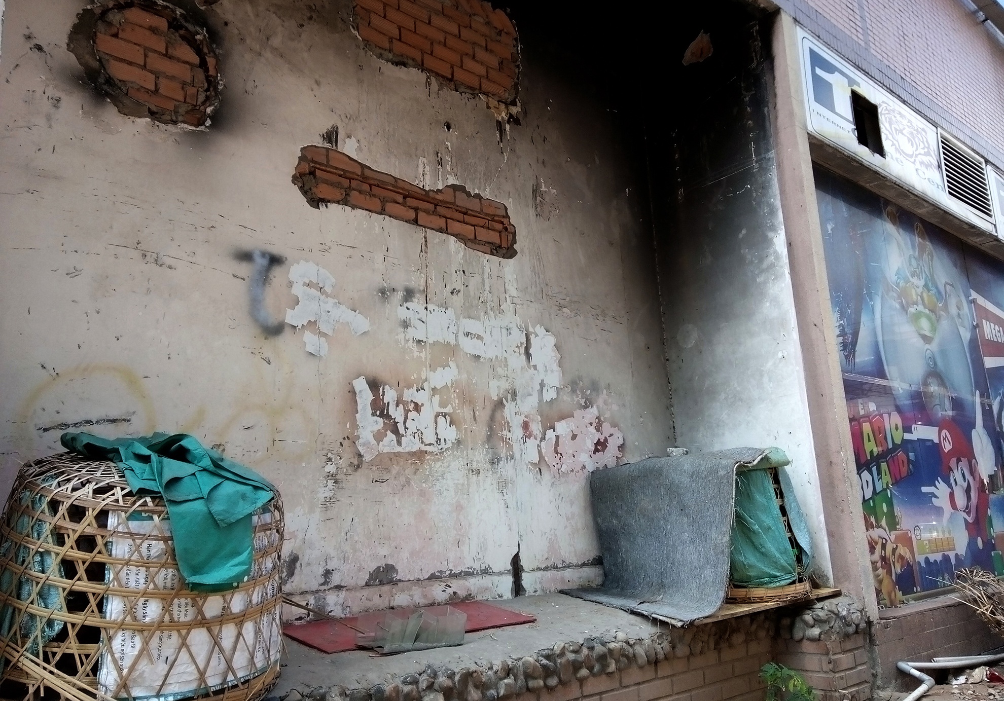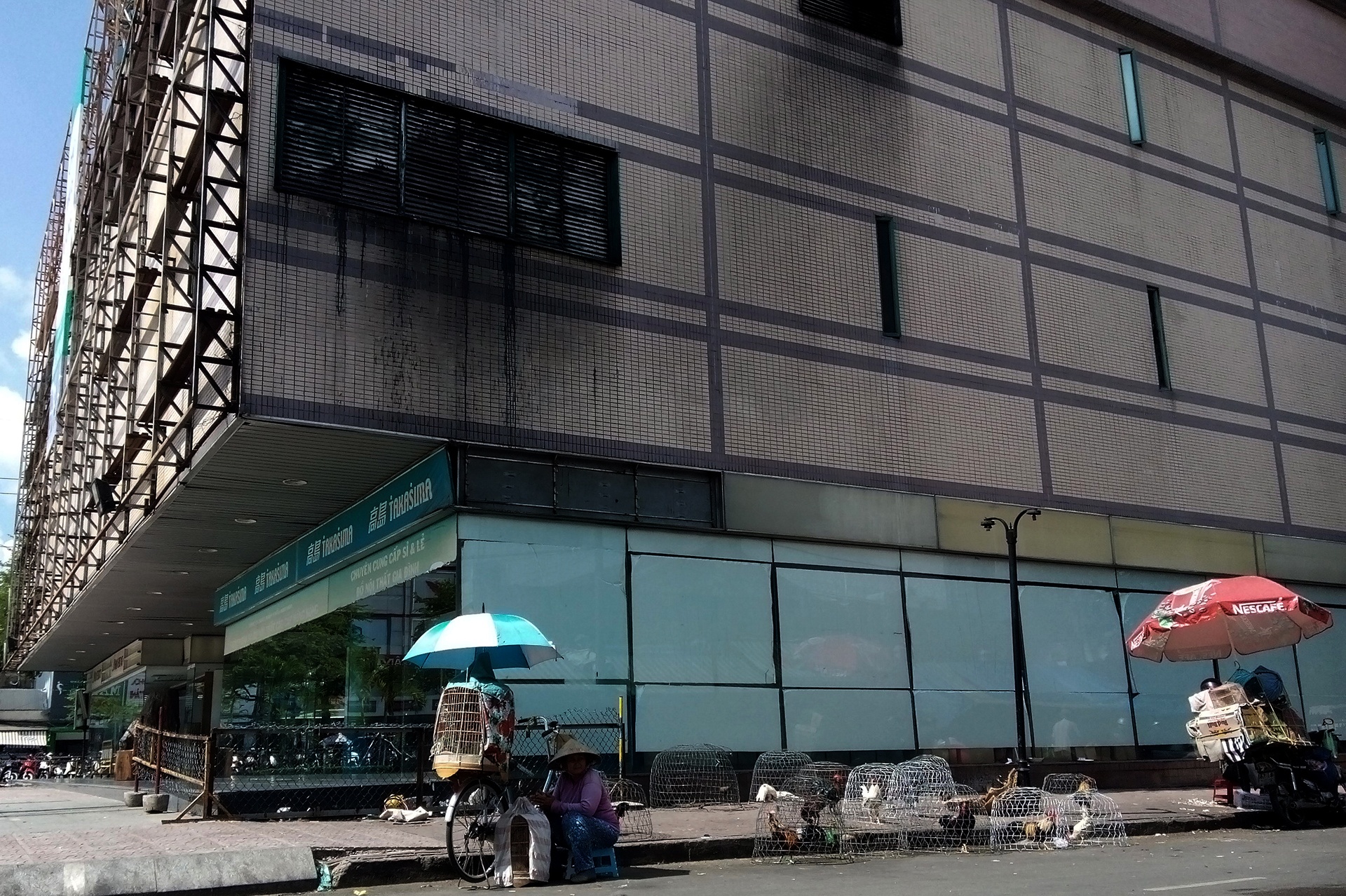 Dấu tích đen nhẻm của bức tường vẫn còn sau vụ cháy khu nhà hàng năm 2009. Kể từ đó, nơi đây ngừng hoạt động và lề đường trở thành địa điểm bán gia cầm.
