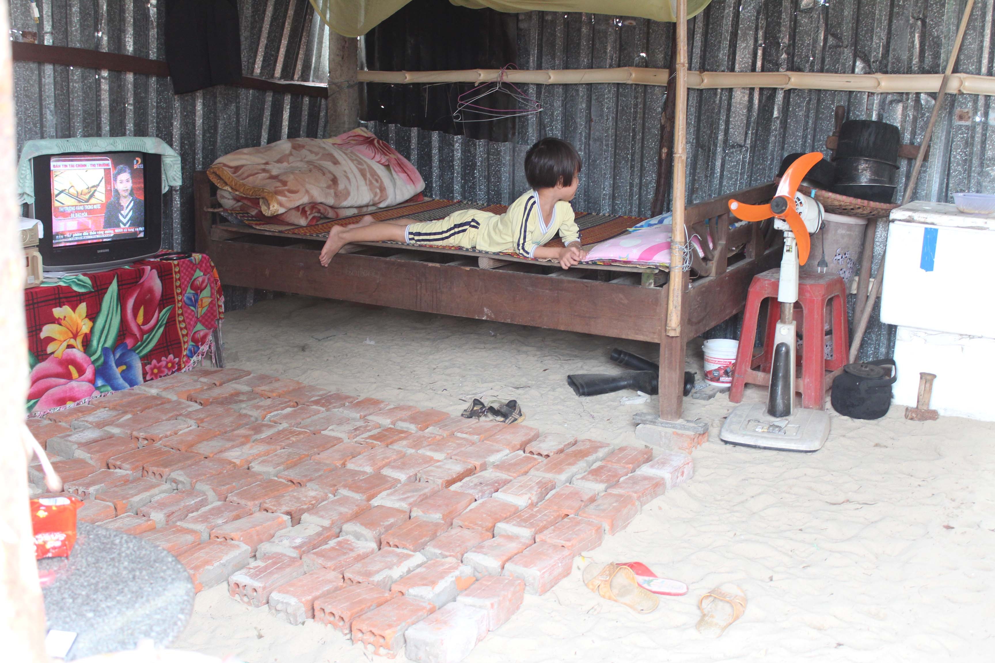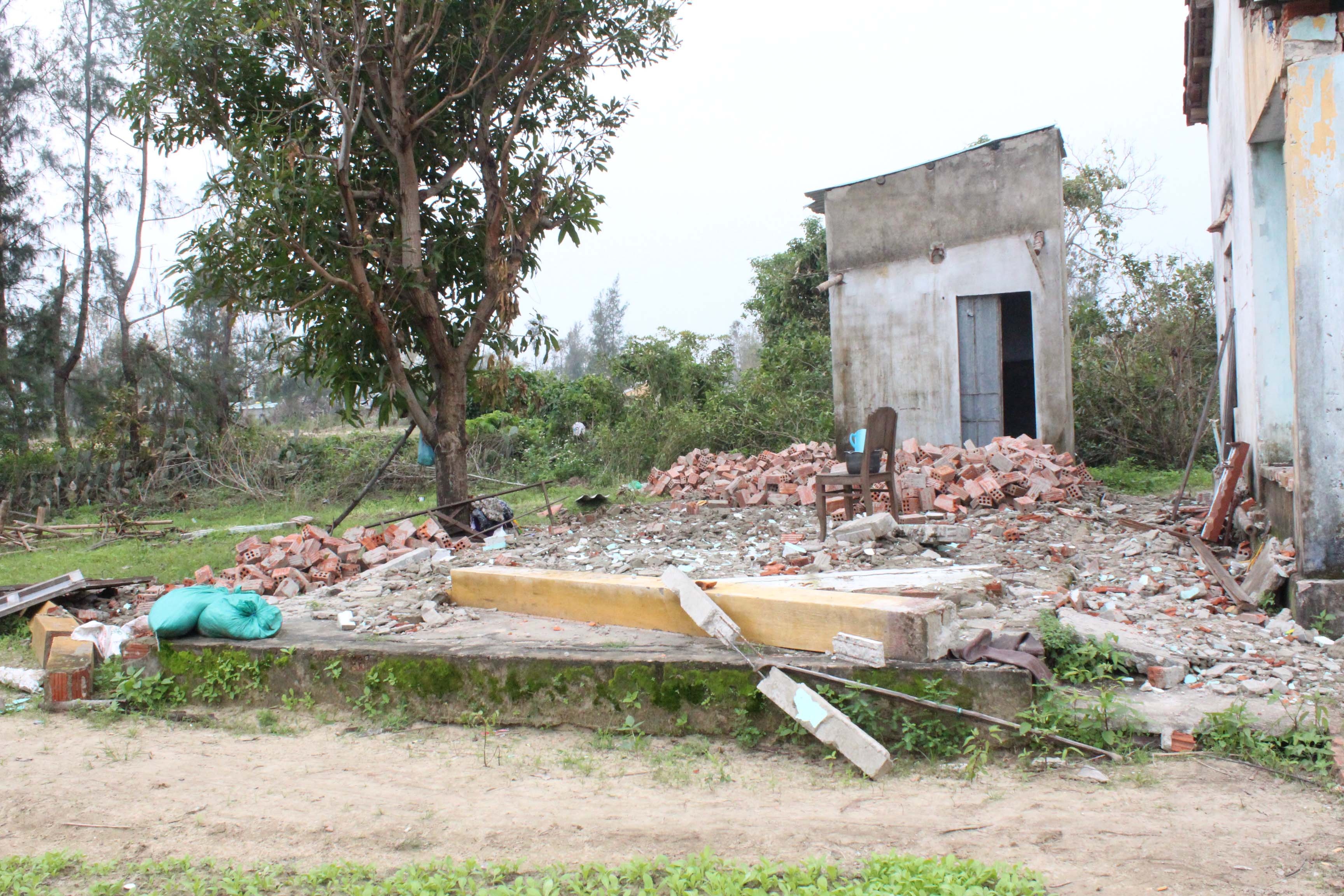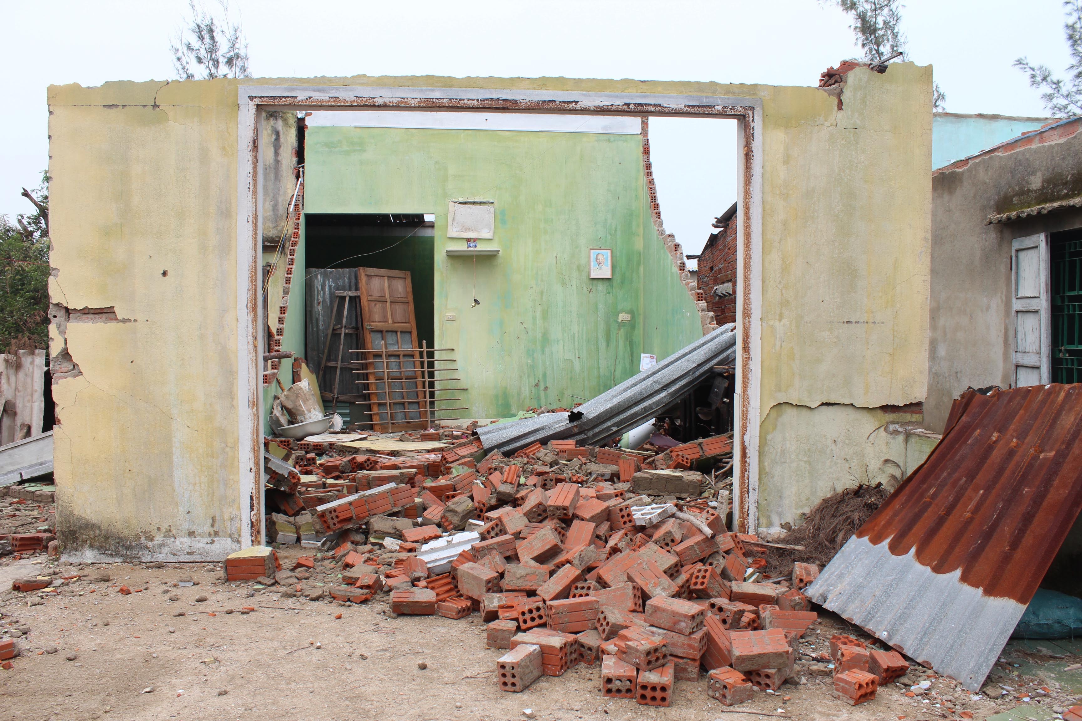 | Căn nhà của cô Giang Thị Bê (con liệt sĩ) bị sập hoàn toàn sau bão số 11. Cô có 4 người con và hiện đang sống cùng người con lớn và 2 cháu ngoại. Thu nhập chủ yếu của gia đình nhờ vào việc hàng ngày ra biển mua cá mang về chợ bán. Với thu nhập ít ỏi, gia đình không đủ tiền để dựng lại nhà. |