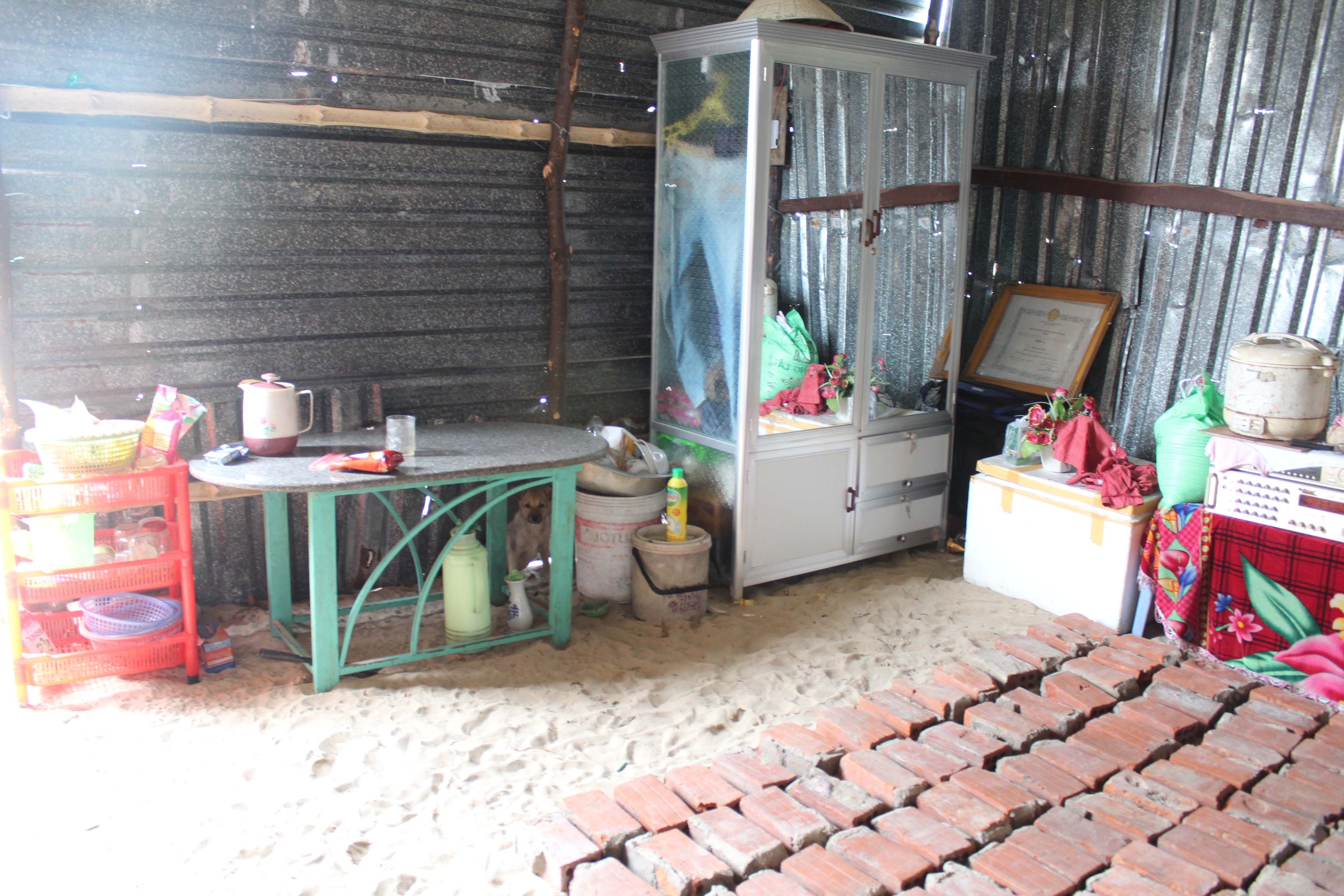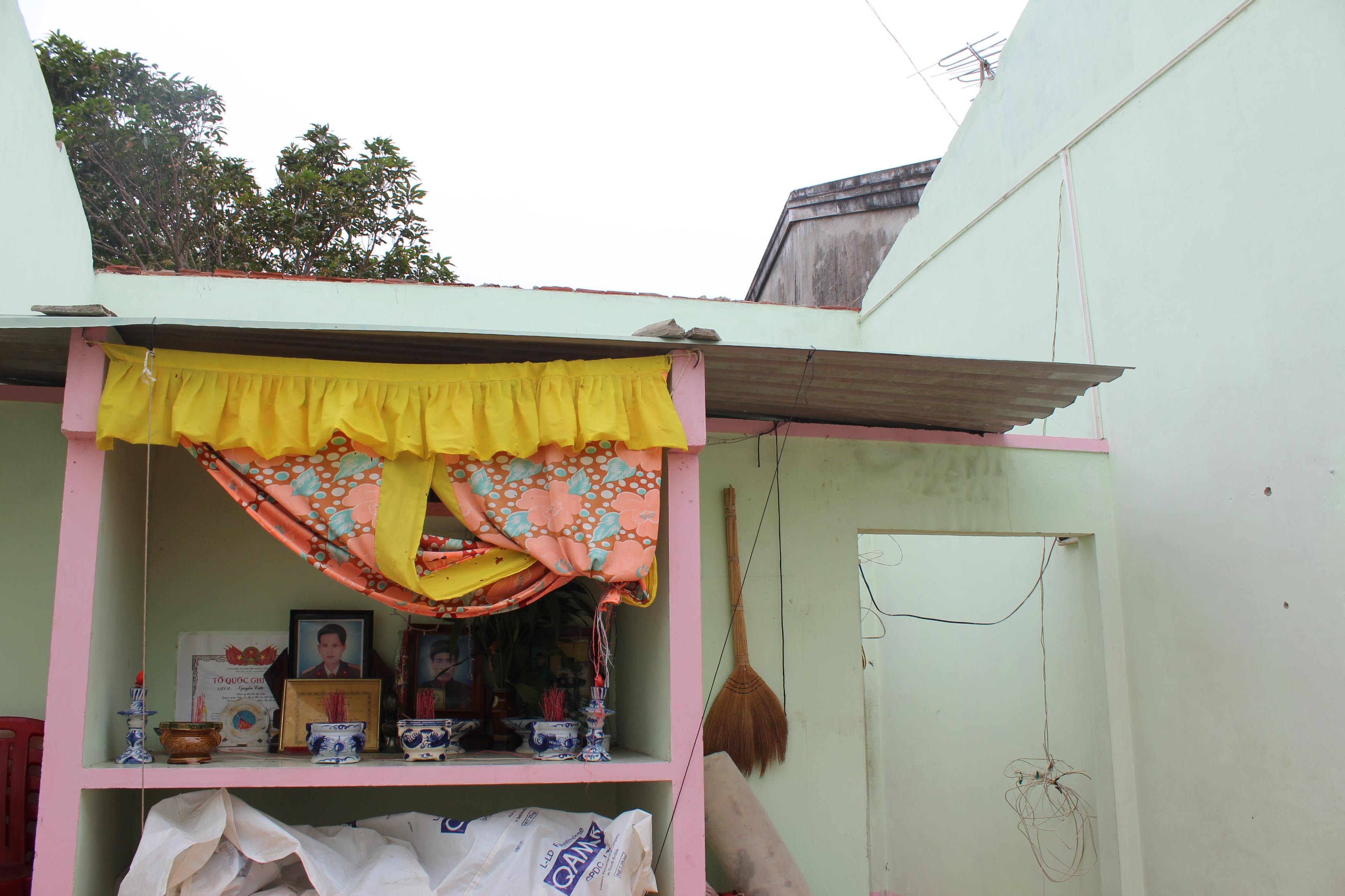 | Chiếc bàn thờ liệt sĩ với mái tôn che tạm tại căn nhà của bà Nguyễn Thị Kính. |