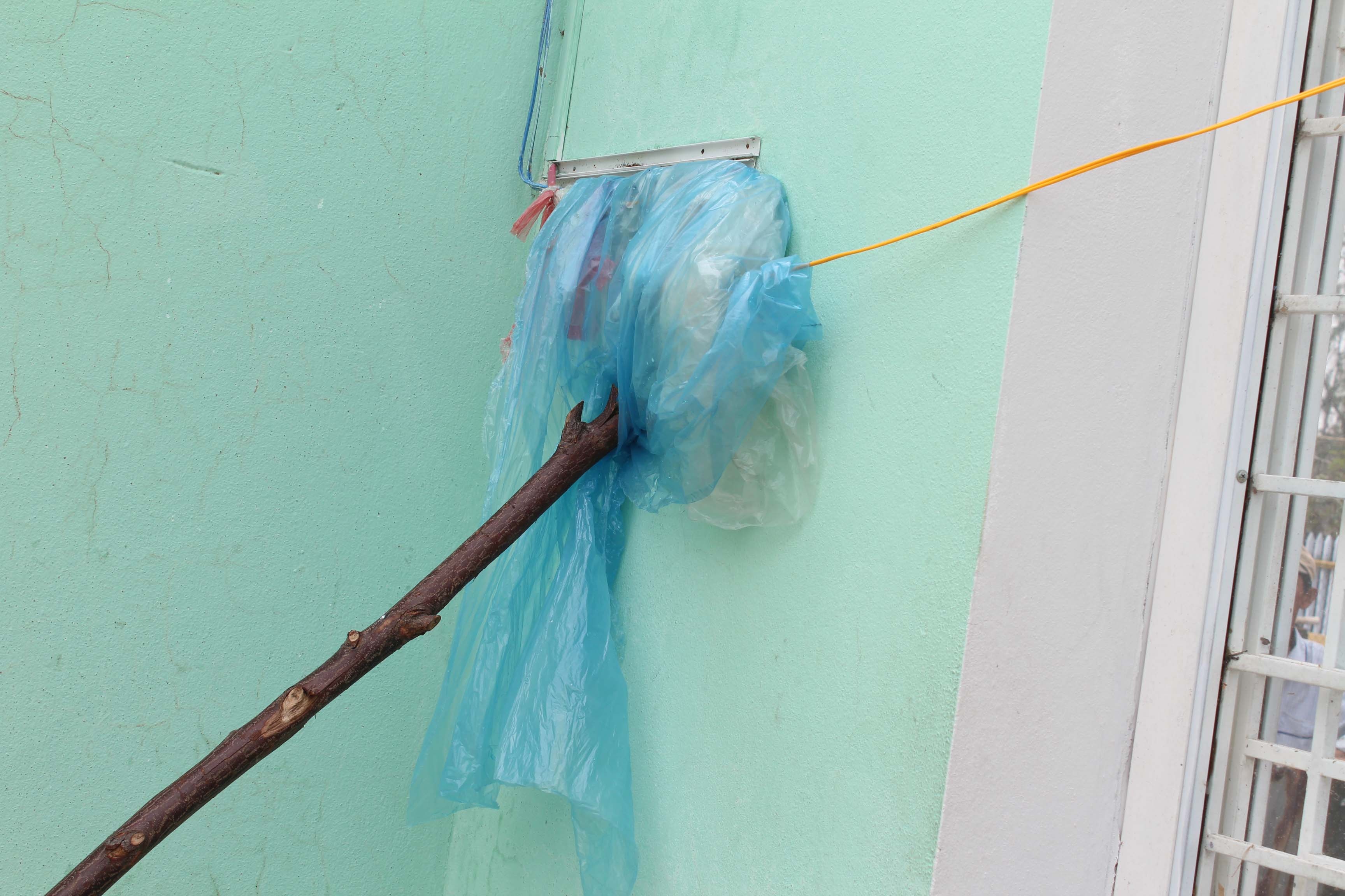 | Để có điện sinh hoạt, chị Mèo đành câu điện từ căn nhà cũ. Ổ cắm phải bọc lại bằng bao ni-lông để tránh mưa. |