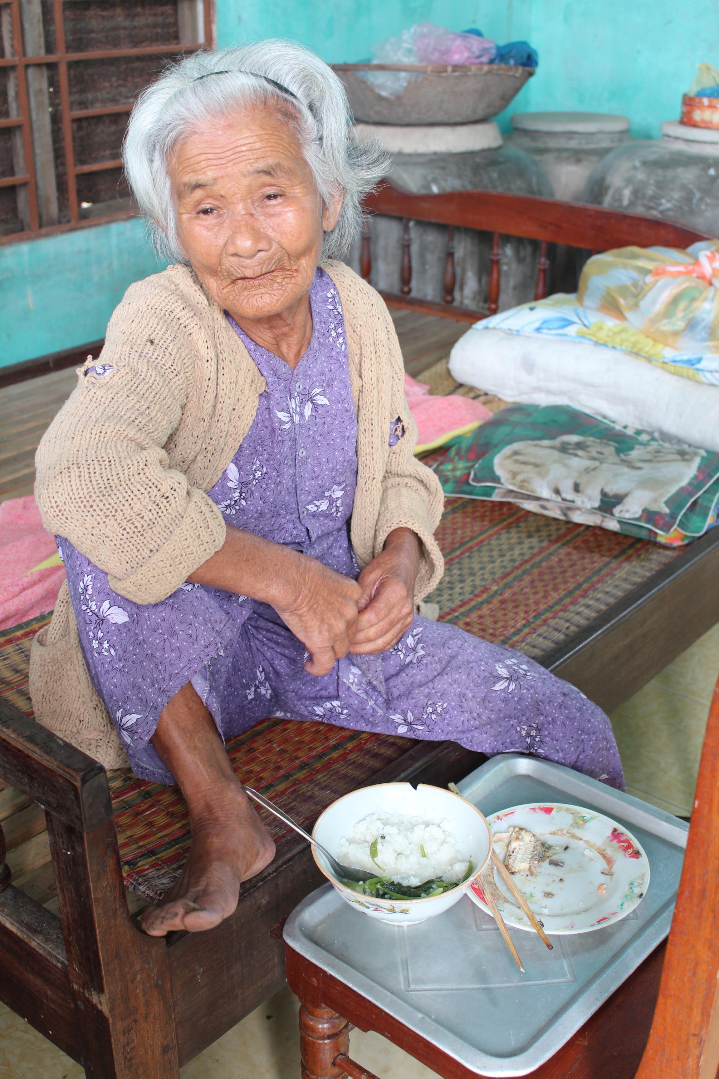 | Sau bão, bữa cơm của mỗi gia đình cũng tiết kiệm hơn. Bà Ngô Thị Nên đang ăn trưa với 1 tô cơm nhão, ít rau luộc và khúc cá. |