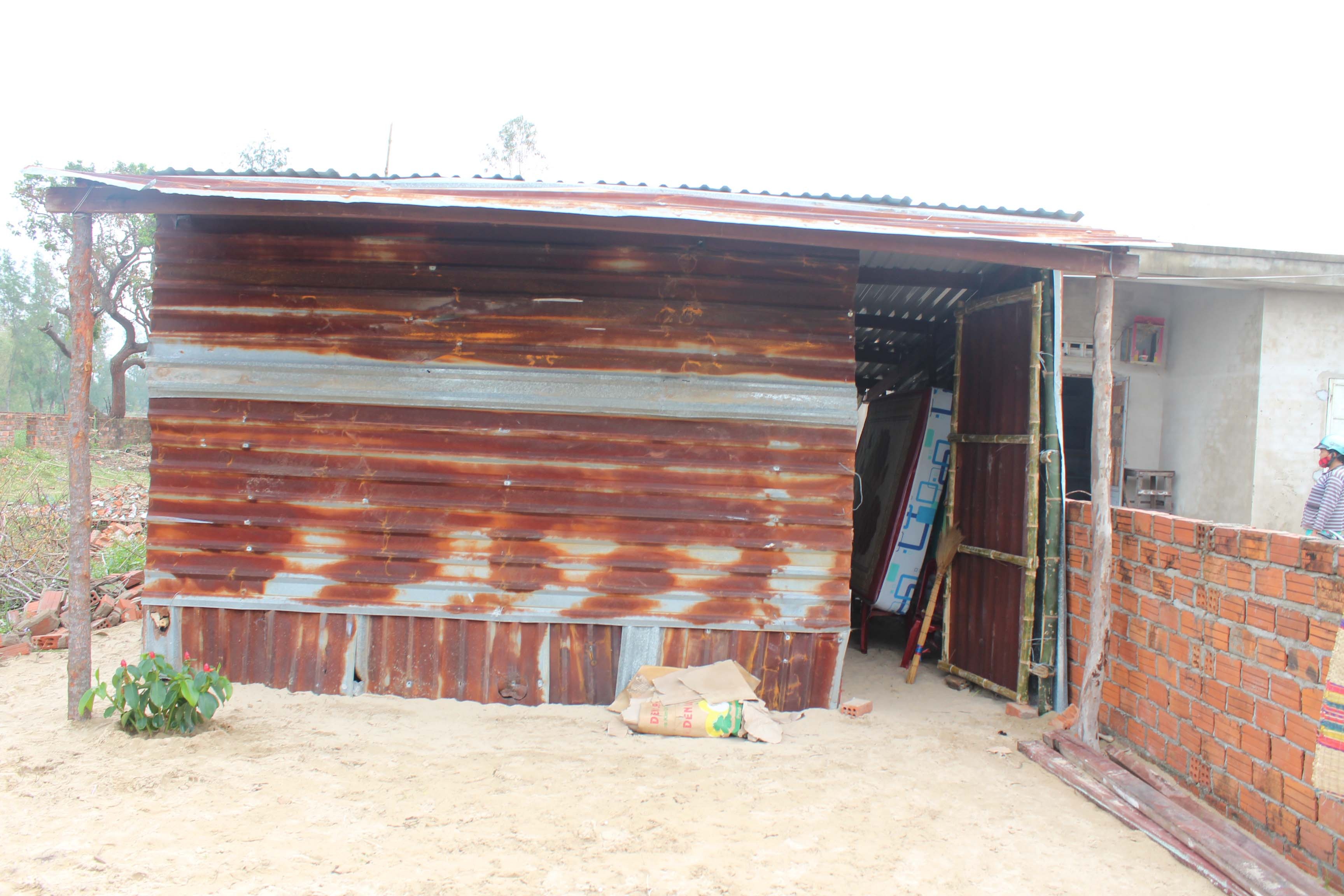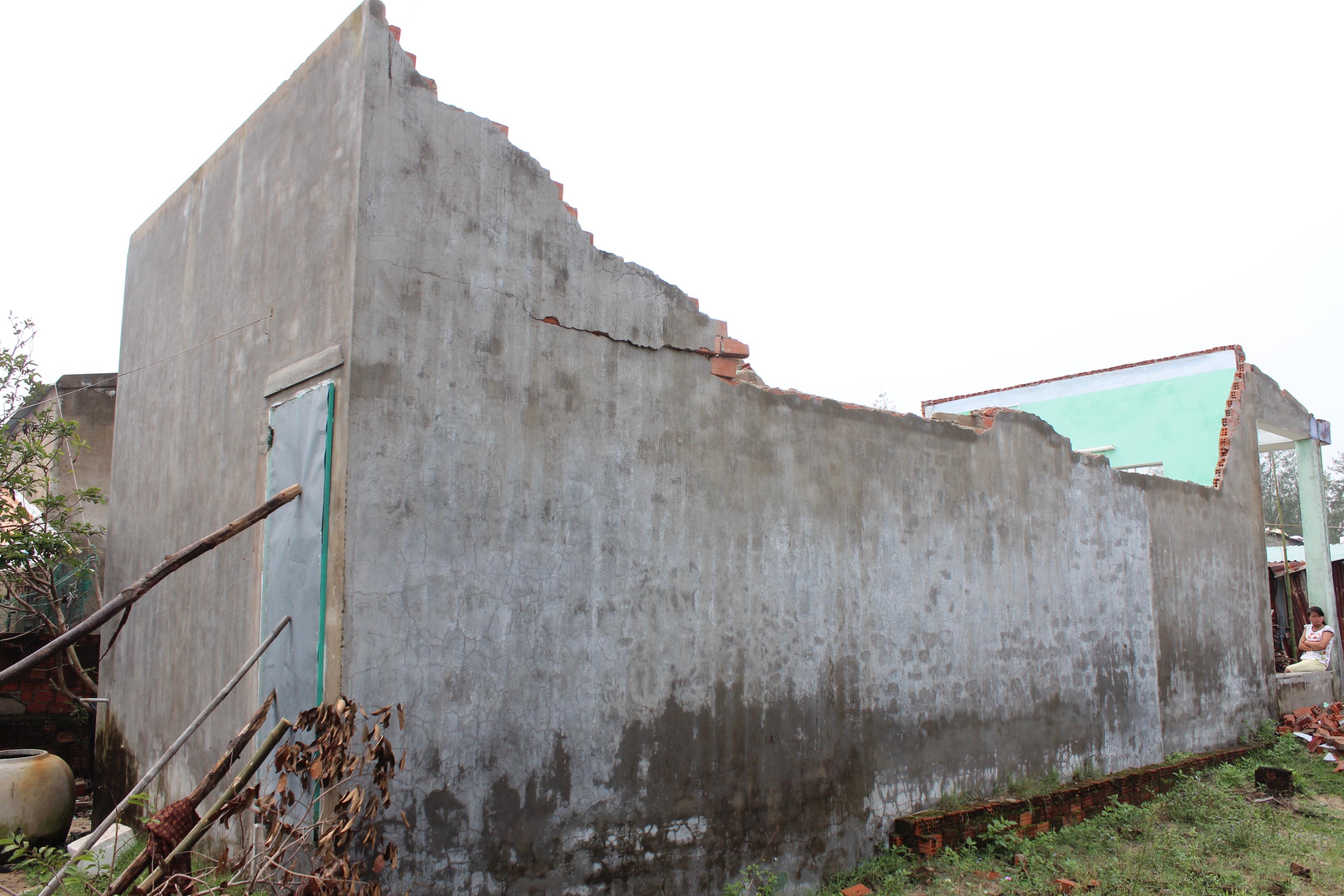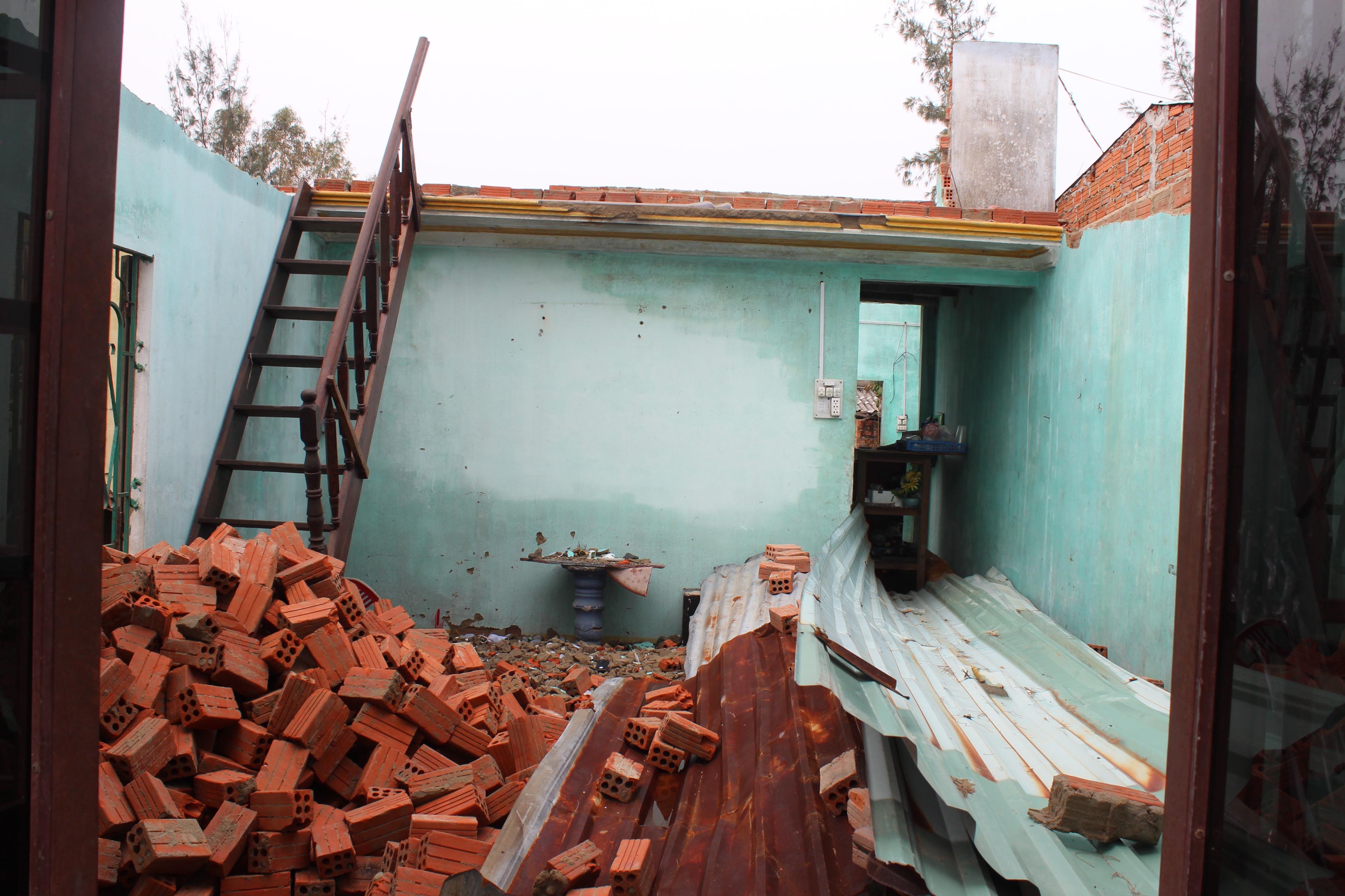 | Nhà của bà Phan Thị Mèo bị tốc mái hoàn toàn và sập mảng tường. Bà sống cùng người con gái 17 tuổi. Gia đình thuộc diện cận nghèo. |