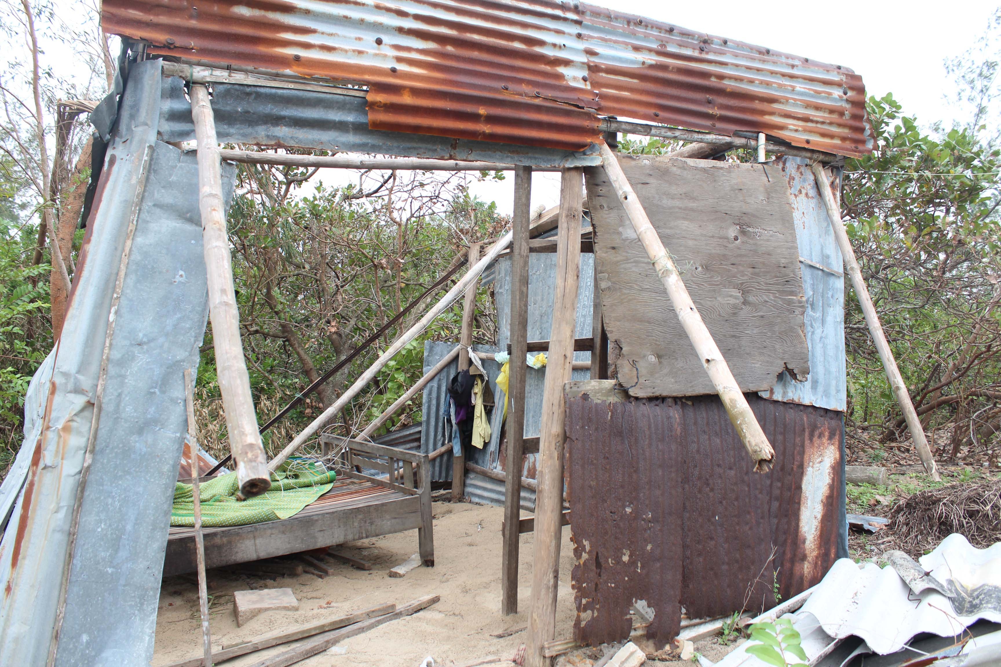 | Căn nhà của anh Đặng Giác bị sập 70%. Anh có 3 người con, đứa lớn nhất đang học lớp 7. Số tiền vay để làm căn nhà vẫn còn 3 triệu chưa trả hết thì bão ập đến đánh sập ngôi nhà. |