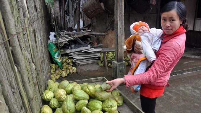 | Chị Bùi Thị Huyền ( 27 tuổi, ở khu vực gần Thác Bạc) bên những quả su su vừa nhặt ở ngoài vườn. |