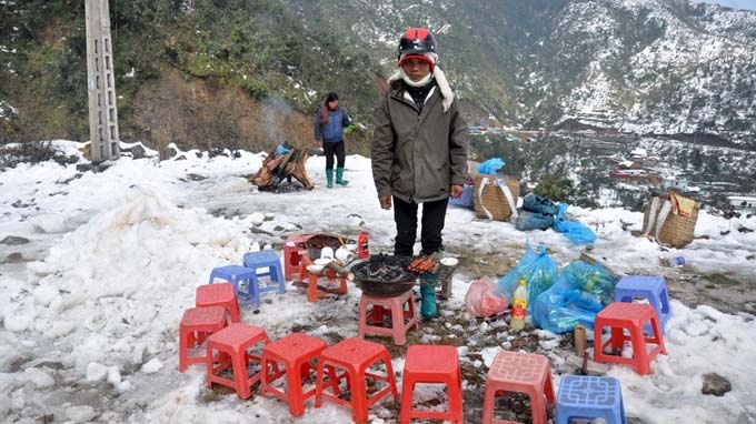 | Người dân mưu sinh bên nền tuyết trắng xóa. |