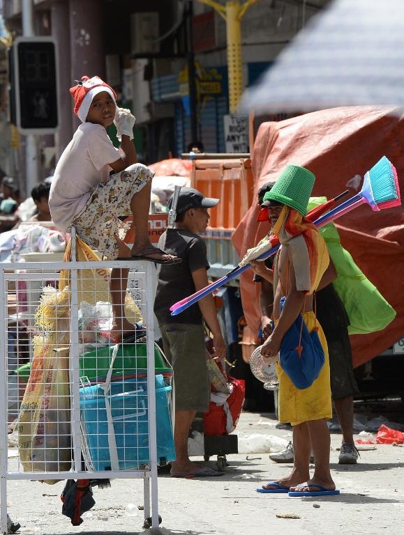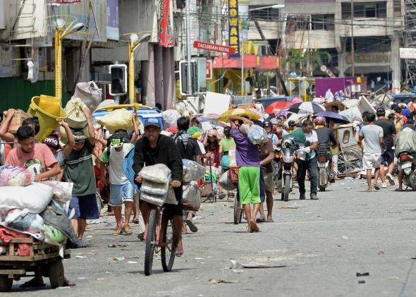| Đám đông chờ chiến lợi phẩm mà một nhóm người hôi của ở một siêu thị phía trên ném xuống tại thành phố Tacloban hôm 9/11. Ảnh: AFP. |