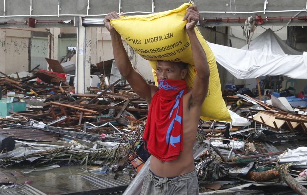 | Một người đàn ông dùng xe đạp để chở những thứ mà anh ta cướp tại một cửa hàng ở Tacloban hôm 10/11. Ảnh: |