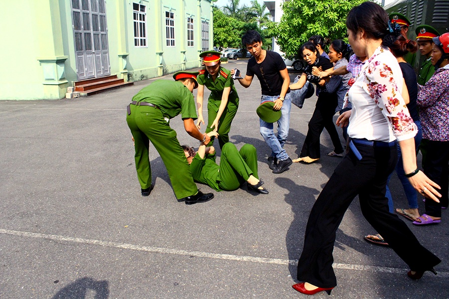 Giữa lúc đám đông bức xúc, có người đã xô ngã nữ cảnh sát đang làm nhiệm vụ tư pháp bảo vệ phiên tòa.