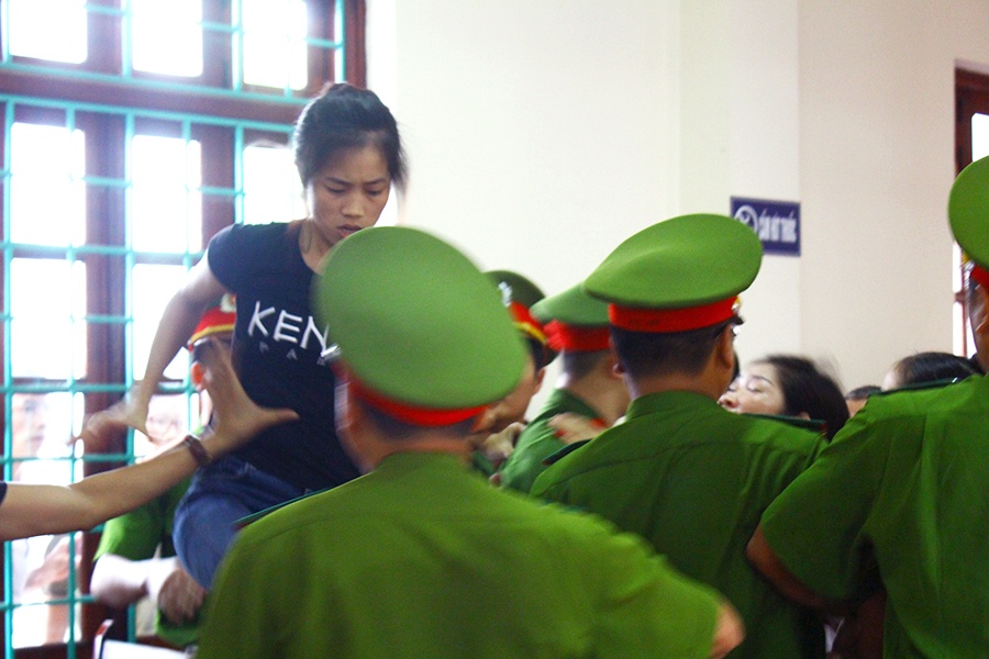 Ngay sau khi bản án được tuyên, người nhà nạn nhân phản ứng gay gắt, có người đã xô ngã cảnh sát tư pháp giữa sân tòa.