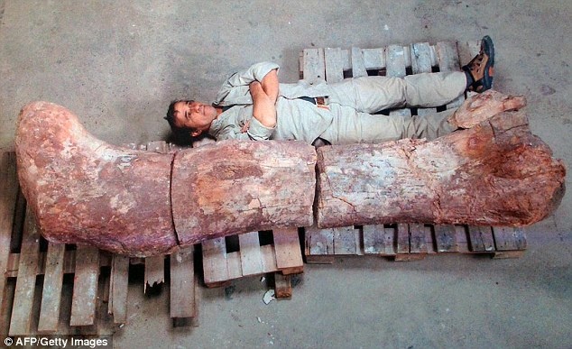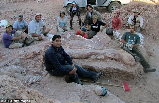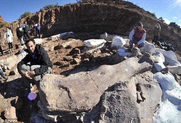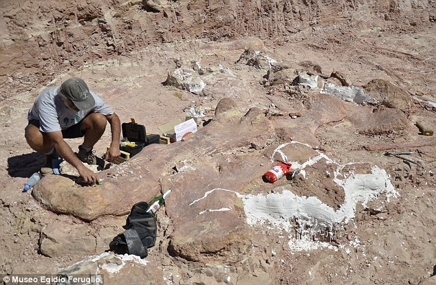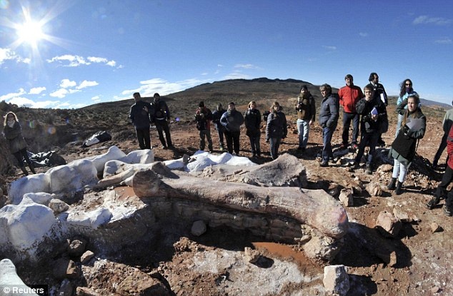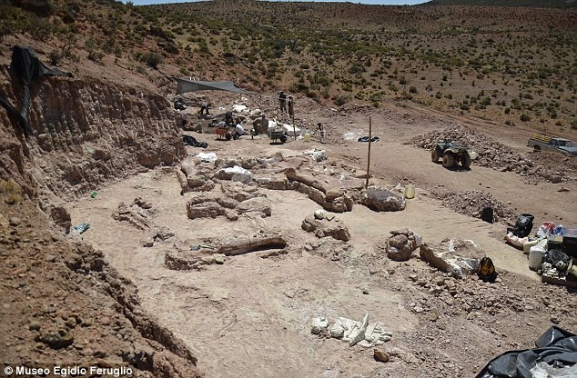 | Họ phát hiện khoảng 150 xương hóa thạch thuộc bộ hài cốt của 7 con khủng long. Chiều dài của những con khủng long lên tới 40 m, còn khối lượng của chúng vào khoảng 77 tấn - lớn hơn cả khối lượng của 14 con voi châu Phi trưởng thành. Ảnh: Reuters |