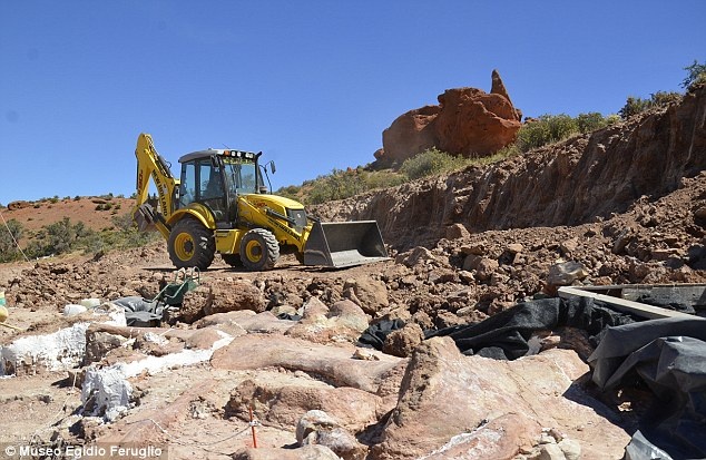 | Máy xúc tham gia hoạt động khai quật. Ảnh: Bảo tàng Egidio Feruglio |