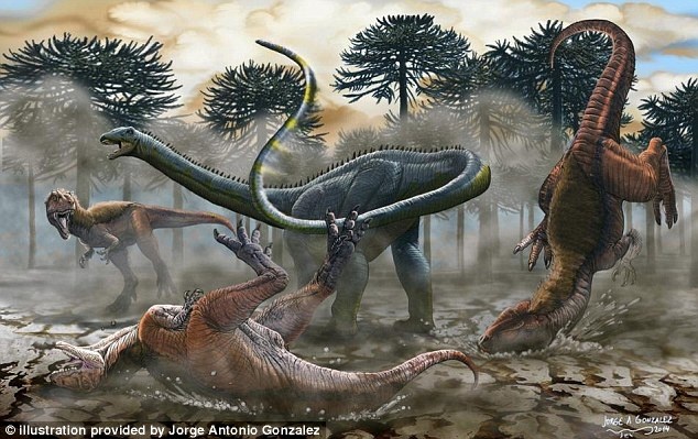 | Hình minh họa loài khủng long lớn nhất hành tinh dùng đuôi để đánh những con khủng long ăn thịt. Đồ họa: Jorge Antonio Gonzalez |