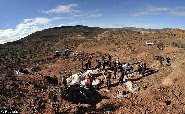 | Người dân và các chuyên gia đứng quanh một mẩu xương khủng long trong một nông trại ở sa mạc. Ảnh: Reuters |