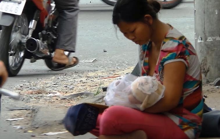 | Hình ảnh người phụ nữ bế con nhỏ ăn xin bên lề đường Lê Đại Hành (quận 11). |