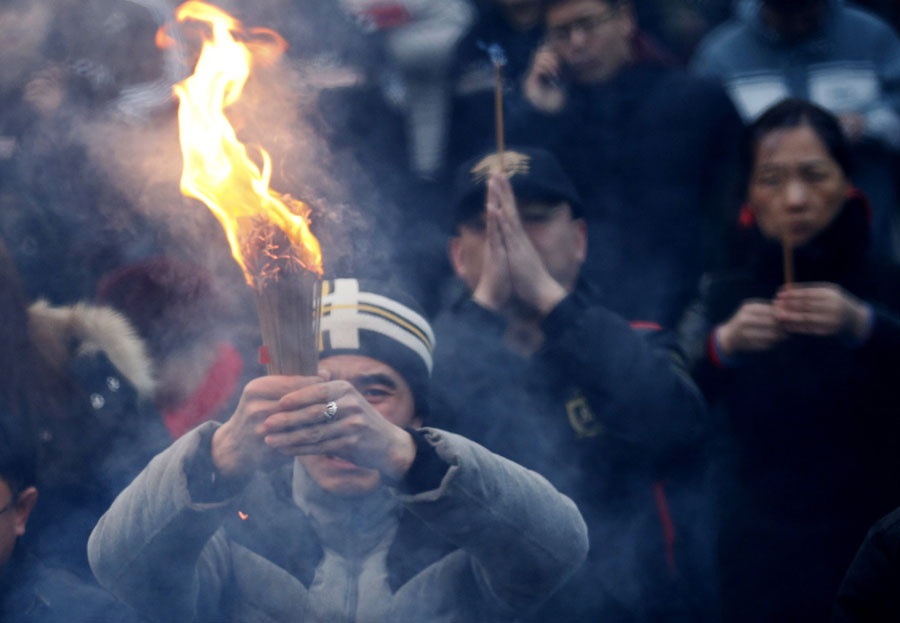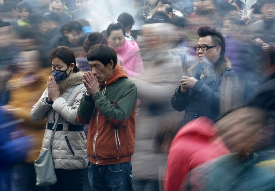 | Như nhiều quốc gia châu Á, người dân Trung Quốc tin rằng, dâng hương tại đền, chùa vào ngày mùng 1 sẽ đem lại may mắn suốt cả năm. |