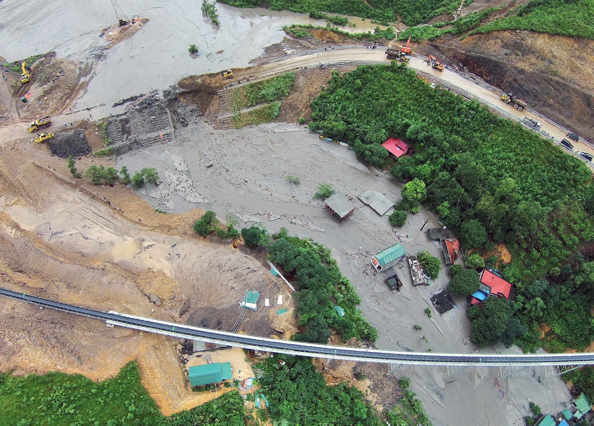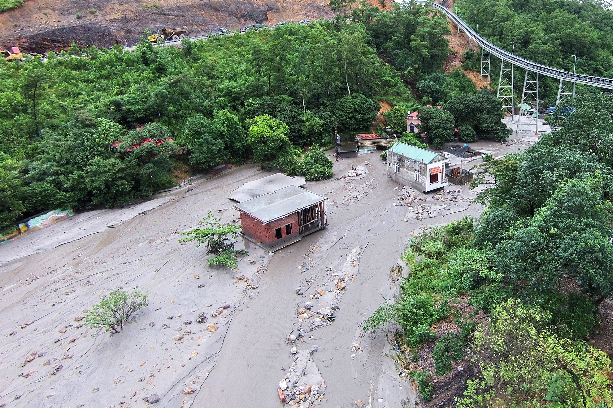 | Khoảng 100 ngôi nhà bị lớp đất đá vùi sâu hơn 2 m. |