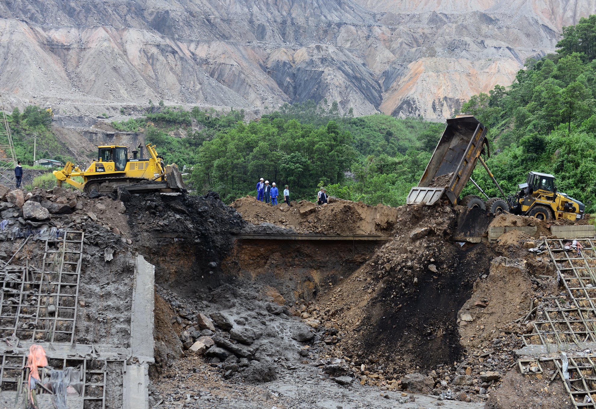 | Hiện công tác khắc phục đập tràn tại mỏ than lộ thiên đang được triển khai tích cực đề phòng mưa lớn trở lại gây thiệt hại cho khu vực chợ Mông Dương, trạm biến áp 110KV. |
