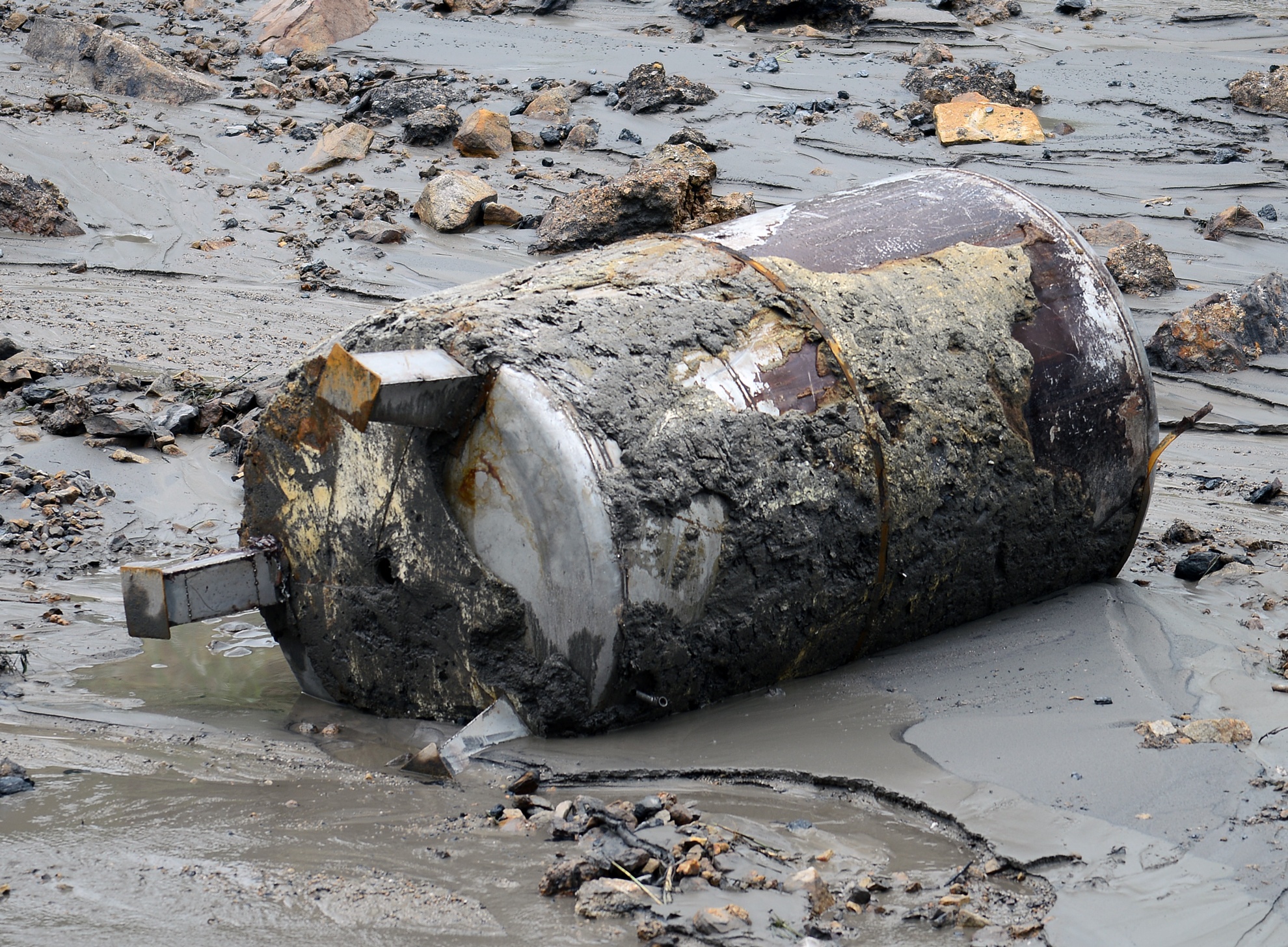 | Bùn đất thải của bãi than Công ty Than Mông Dương (phía trên) theo nước mưa tràn qua đập trôi xuống khu vực dân cư ở phường Mông Dương (Cẩm Phả) nằm ngay dưới chân mỏ lộ thiên. Nhiều ngôi nhà ở khu vực tổ dân phố 1 và 2 của khu 4 (phường Mông Dương) đã bị vùi lấp hoàn toàn |