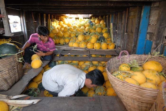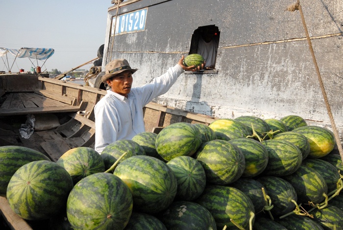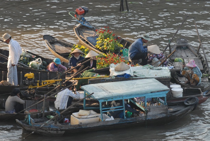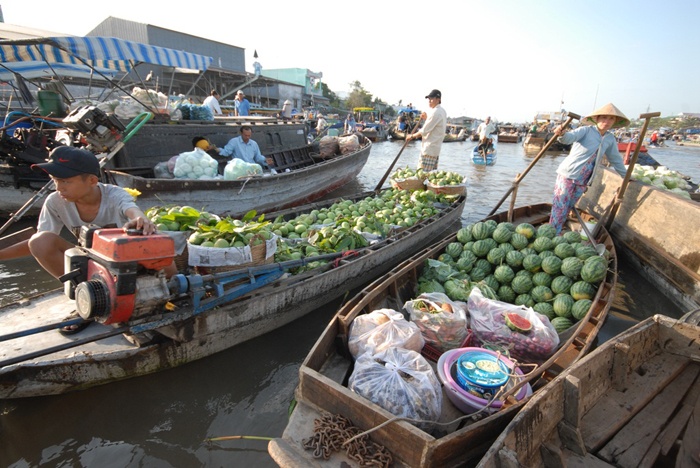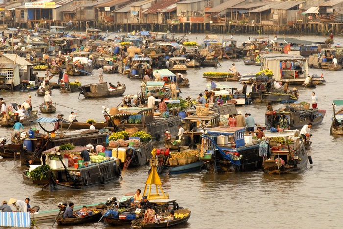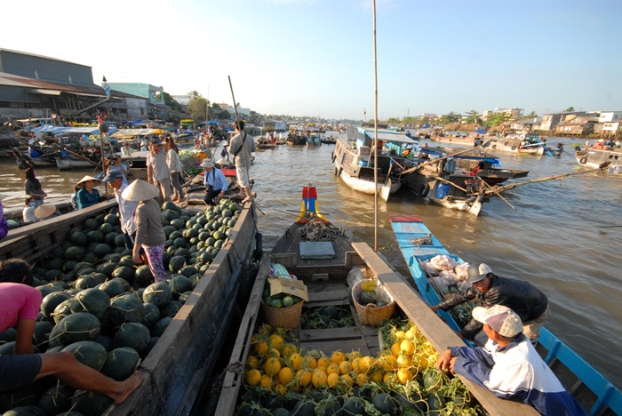 | Những chiếc xuồng chở đầy nông sản tụ lại họp thành chợ nổi dài hàng cây số trên sông. |