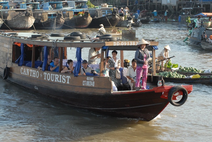 | Du khách nước ngoài thích thú khi tham quan chợ nổi sông nước ở miền Tây. |