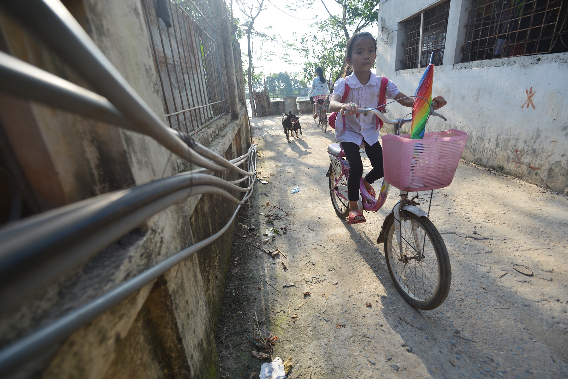 Em Nguyễn Thị Tình (16 tuổi), đang rửa rau chuẩn bị cho bữa cơm của gia đình dưới nguồn nước được lấy từ ao về nhà sau khi lọc qua bể.