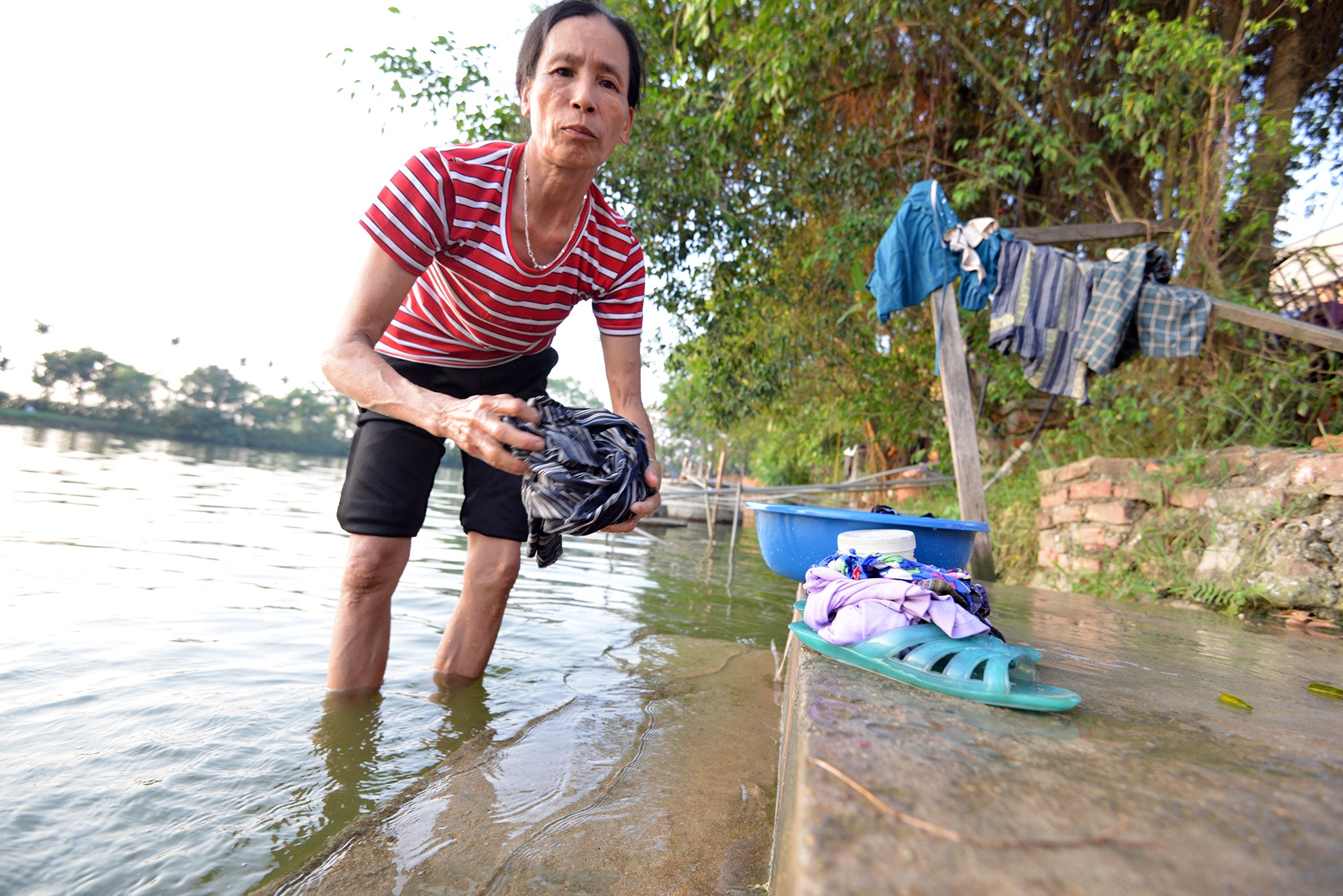 Bà Thúy giặt quần áo tại ao Sen, nơi cung cấp nước sinh hoạt của 2.000 người dân Ngọc Than.