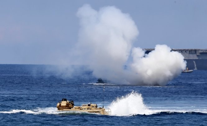 | Lính thủy đánh bộ Mỹ và Philippines tập trận giành lại đảo. Ảnh: Reuters |