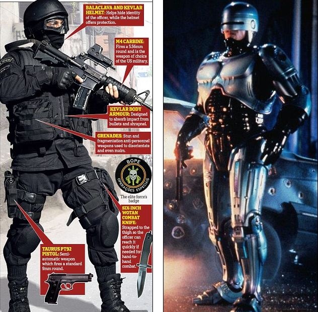 | Một biệt đội cảnh sát gồm 400 người được thành lập trong trang phục "Robocop" (Cảnh sát người máy - tên một bộ phim nổi tiếng của Mỹ). Đây là sáng kiến của sở cảnh sát Rio de Janeiro, thành phố vốn nổi tiếng với vấn nạn bạo lực nhức nhối nhất tại xứ sở samba. |