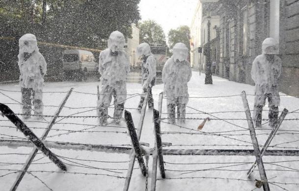 | Cận cảnh hai "người tuyết" tại thủ đô Brussels (Bỉ). Ảnh: Reuters. |