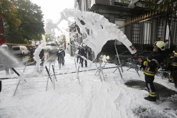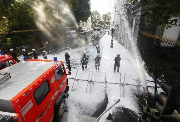 | Lính cứu hỏa dùng vòi chuyên dụng để phun bọt trắng xóa đường phố và phun đầy vào người cảnh sát ngày 7/10 khi họ biểu tình đòi cải thiện điều kiện làm việc. Ảnh: Reuters. |