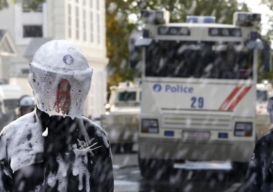 | Bọt phủ kín mũ cảnh sát chống bạo động tại Brussels (Bỉ) ngày 7/10. Ảnh: Reuters. |