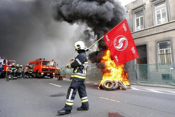 | Một lính cứu hỏa vác cờ đi ngang qua đống lốp xe đang cháy trong đợt biểu tình ngày 7/10. Nhiều cuộc biểu tình của lính cứu hỏa từng xảy ra tại thủ đô Brussels. Ảnh: Reuters. |