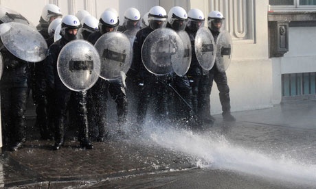 Cảnh sát chắn bọt tại Brussels (Bỉ) tháng 2/2012. Lính cứu hỏa biểu tình để đòi giữ nguyên tuổi nghỉ hưu là 58 tuổi. Ảnh: Rex Features. |