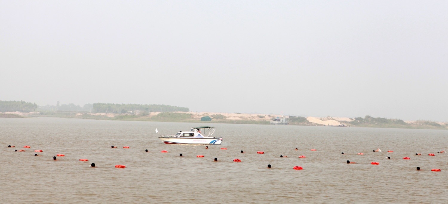 Tại cuộc diễn tập, các cán bộ, chiến sĩ thực hành kỹ thuật bơi cơ bản (bơi ếch, bơi trườn sấp), bơi cứu người đuối nước.