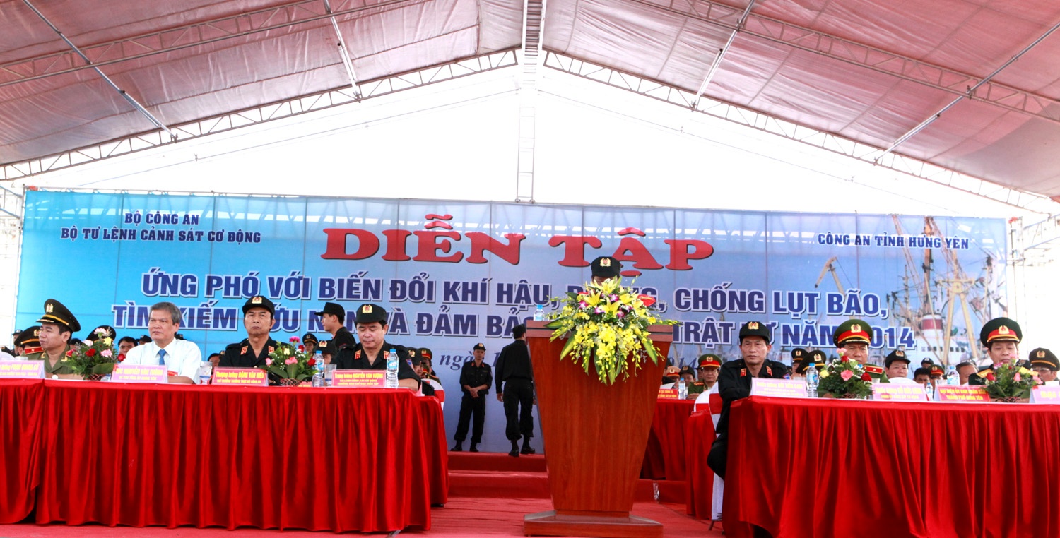 | Ngày 15/10, trên khu vực cầu Yên (phường Lam Sơn, TP Hưng Yên), Bộ Tư lệnh Cảnh sát cơ động (K20) chủ trì phối hợp với Công an tỉnh tổ chức “Diễn tập phương án ứng phó với biến đổi khí hậu, phòng, chống lụt bão, tìm kiếm cứu nạn và đảm bảo an ninh trật tự năm 2014”. Thượng tướng Đặng Văn Hiếu, Thứ trưởng thường trực Bộ Công an nhấn mạnh, buổi diễn tập nhằm nâng cao nhận thức, ý thức trách nhiệm của cán bộ, chiến sĩ Công an nhân dân cũng như của các cấp, các ngành, đoàn thể và nhân dân trong việc chủ động sẵn sàng ứng phó với những tình huống xấu xảy ra, hạn chế mức tối đa những thiệt hại về người và tài sản cho nhân dân. |