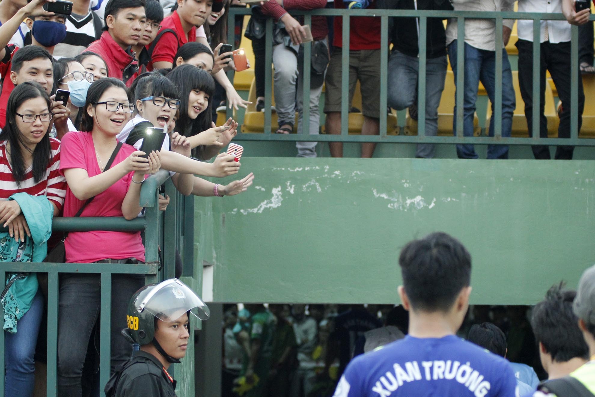 | Sau khi kết thúc trận đấu, hàng trăm fan nữ đã kéo đến hàng rào chờ Công Phượng, Tuấn Anh... cùng đội HAGL đề chụp hình. |