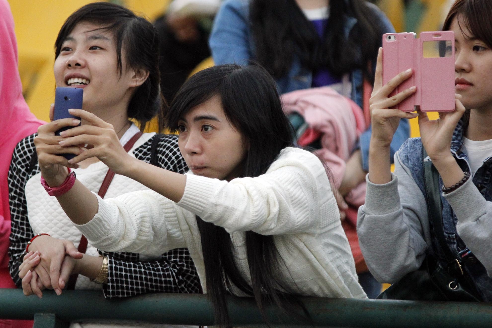| Một fan nữ cố nhoài người qua hàng rào sắt để chụp hình các cầu thủ HAGL. |