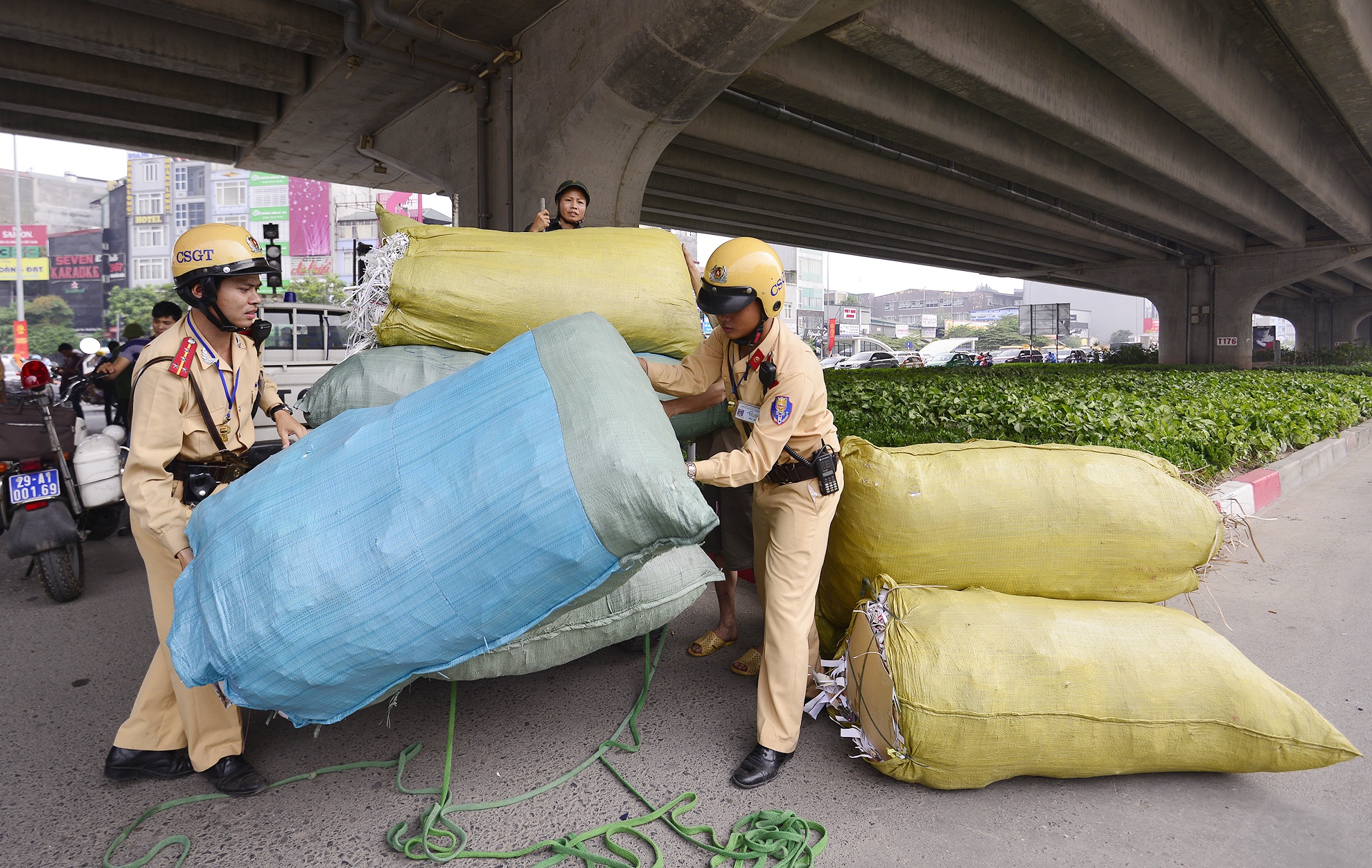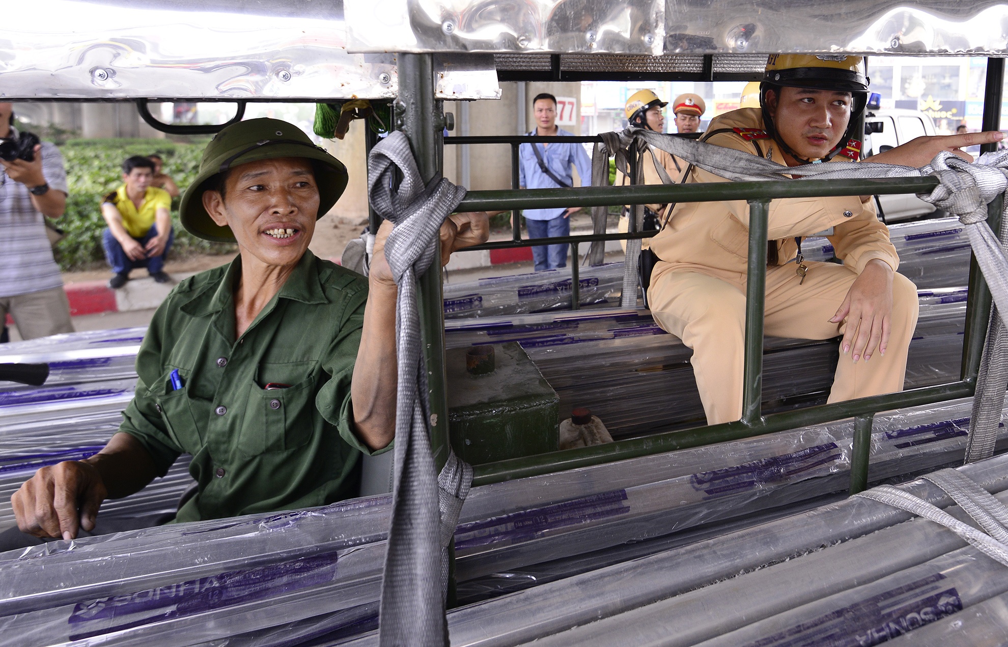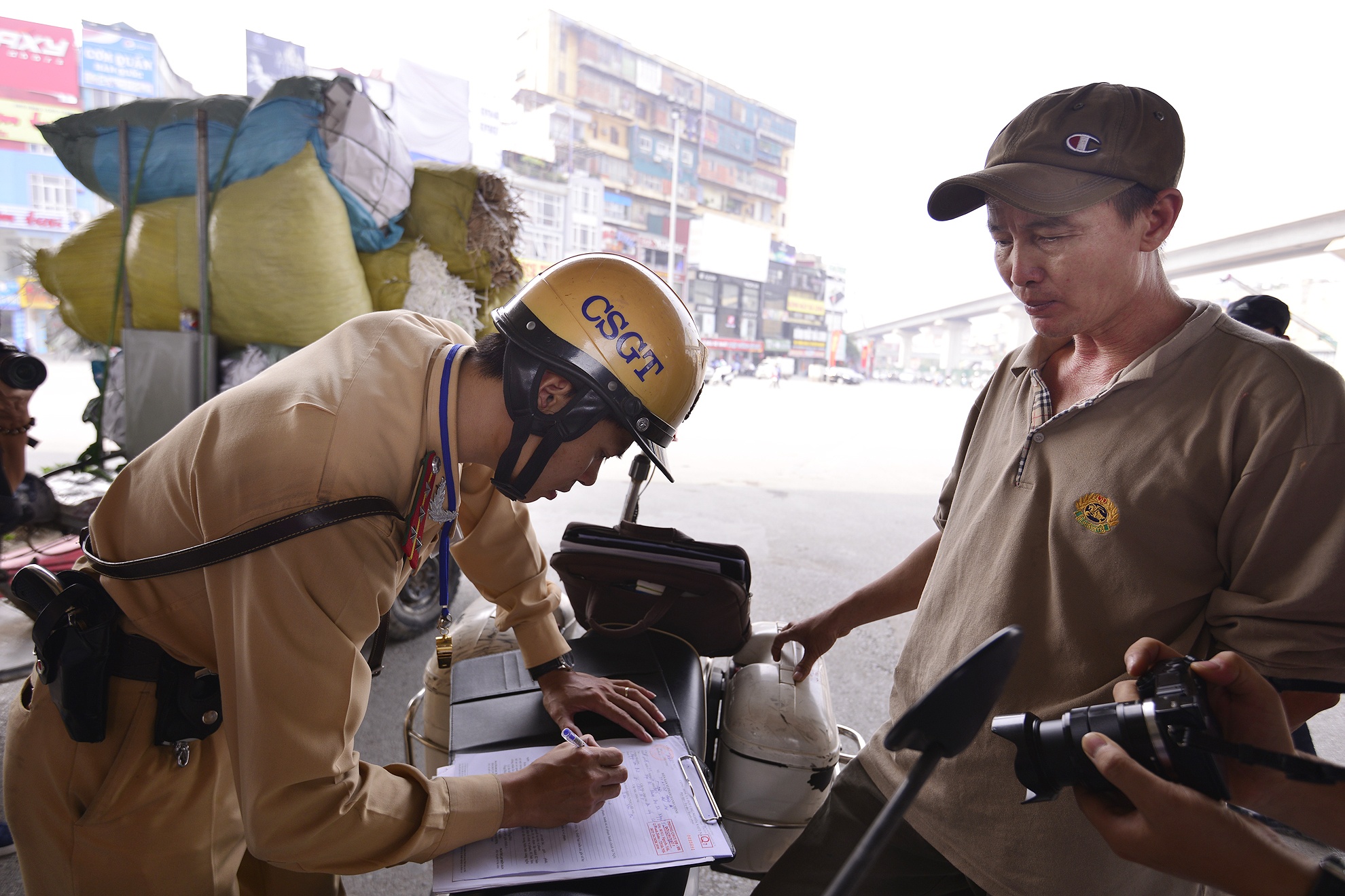 Trong buổi sáng, cảnh sát đã xử lý một số trường hợp tài xế không phải thương binh, không xuất trình giấy đăng ký, bằng lái xe khi phạm lỗi chở hàng cồng kềnh.