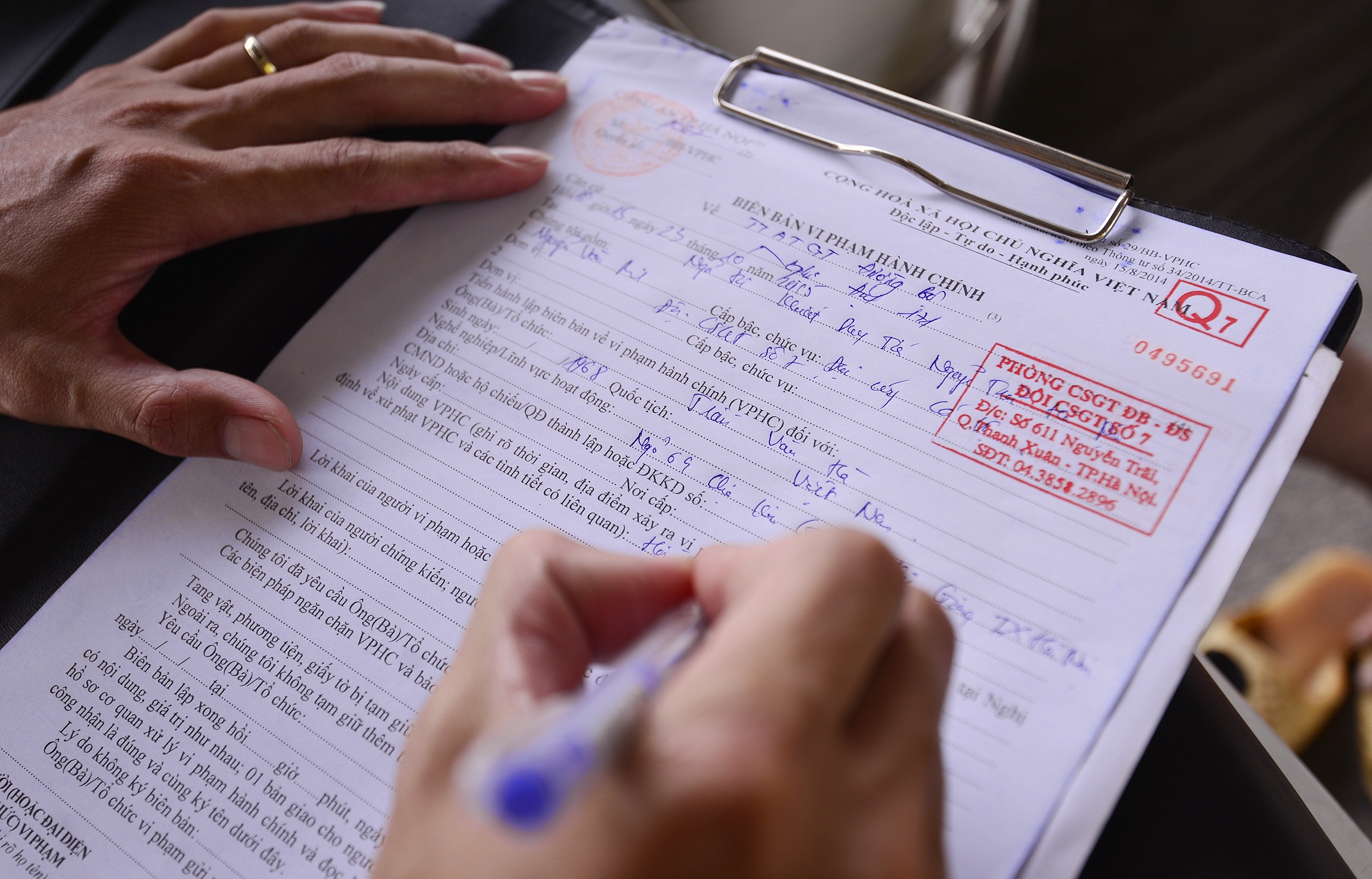 | Do không có phương tiện để chở chiếc xe nên CSGT phải ngồi phía sau, yêu cầu ông lái về kho tập kết. Theo các chiến sĩ CSGT số 7, nhiều tài xế vi phạm không phối hợp, thậm chí không ký văn bản bỏ đi và gây áp lực ngay tại trụ sở của đội. |
