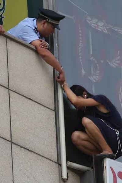 Một phụ nữ leo lên bảng hiệu quảng cáo lớn đúc bằng bê tông của một tòa nhà cao chót vót ở Bắc Kinh-Trung Quốc. Nhiều người nhìn thấy đã báo cảnh sát để thuyết phục, ngăn chặn vụ việc. Trong lúc các cảnh sát viên đang nói chuyện với người phụ nữ trên, một cảnh sát quyết định cách tốt nhất để cô này không đột ngột nhảy là còng tay mình với cô ấy.