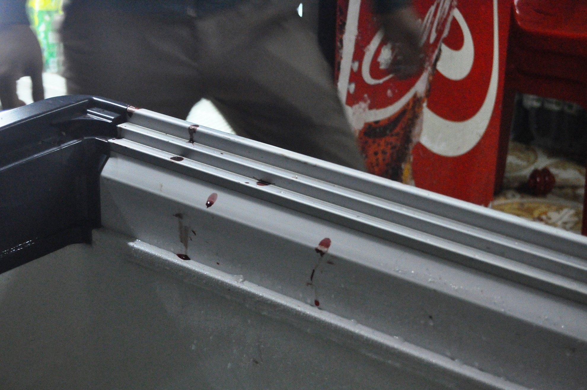 | Vết máu còn vươn trên cửa kính tủ lạnh đã bị thanh niên đập vỡ kính tại quán cà phê trong công viên Nghĩa Đô. Ảnh: Hoàn Nguyễn. |