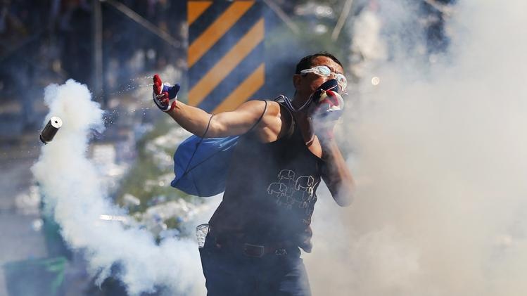 Một người biểu tình đeo mặt nạ phòng độc ném đá về phía cảnh sát. Đám đông cũng bao vây ít nhất ba đài truyền hình để yêu cầu các đài phát sóng bài phát biểu của những người lãnh đạo cuộc biểu tình. Một trong ba đài truyền hình thuộc sở hữu của chính phủ. Hàng loạt siêu thị, cửa hàng tại Bangkok đóng cửa. Ảnh: Reuters.