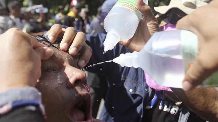 Vài người phun nước muối vào mắt một người đàn ông sau khi hơi cay xộc vào mắt anh này. Ảnh: AP.