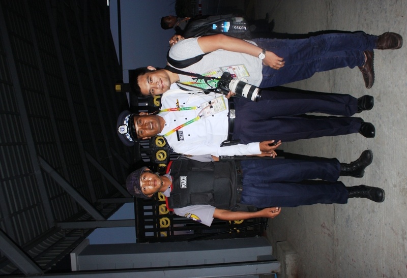 | Phóng viên chụp ảnh cùng 2 cảnh sát Myanmar. |