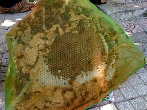 | Một tổ ong chứa chi chít hàng trăm con ong "sát thủ". Theo người bán, nguồn ong được bắt trong môi trườn tự nhiên rừng núi ở Châu Đốc (An Giang) và các tỉnh miền Tây giáp biên giới Campuchia. |