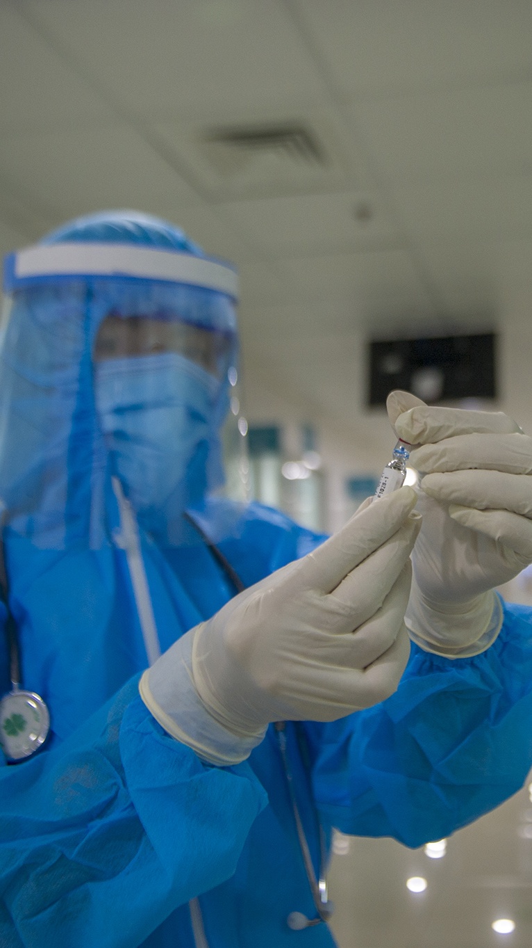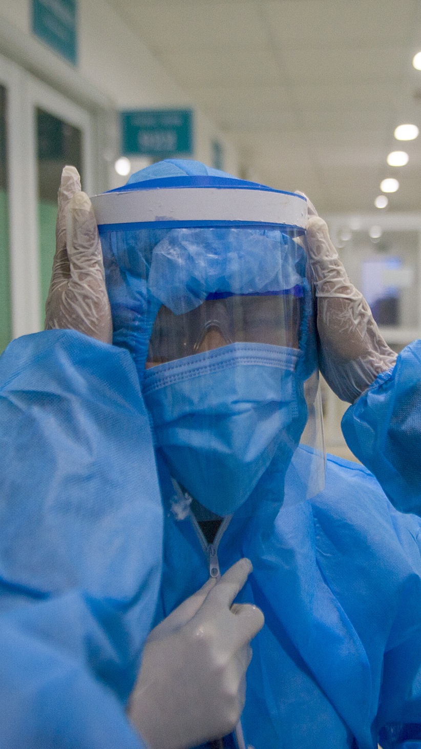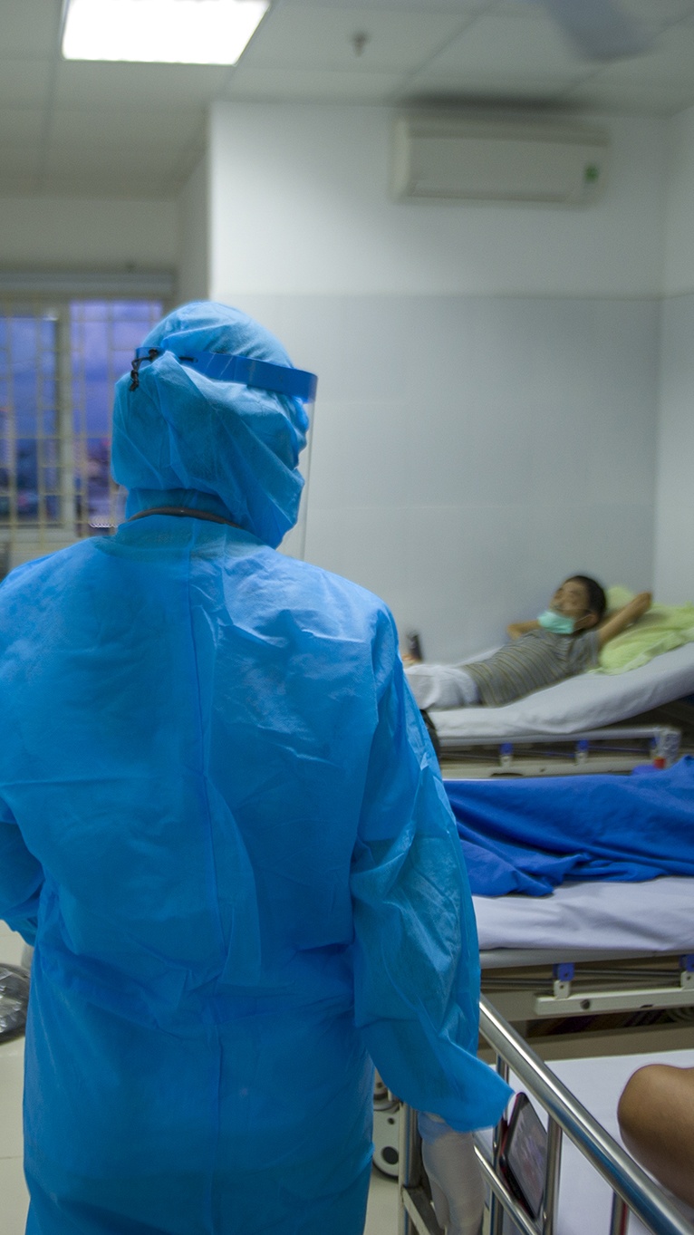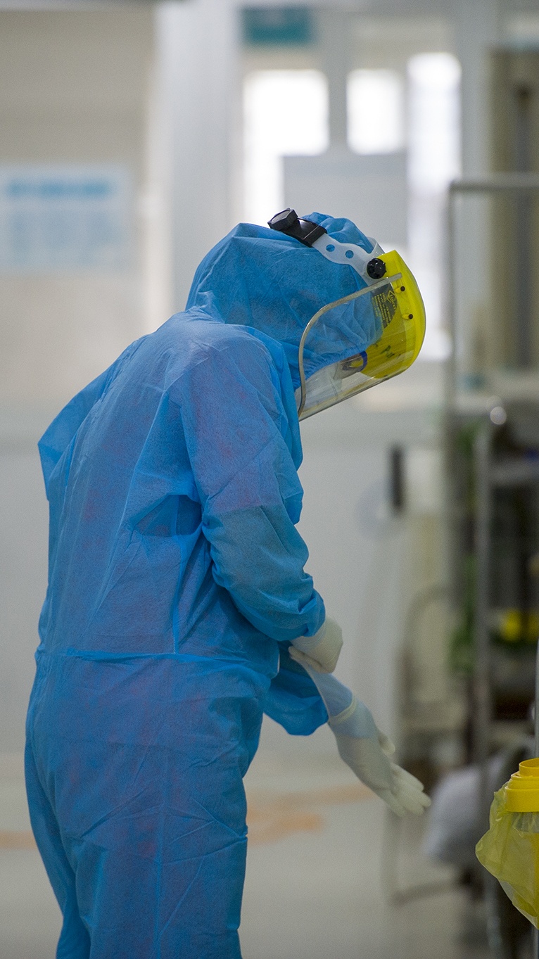 | Trong khu vực cách ly đặc biệt để điều trị bệnh nhân, các y bác sĩ thực hiện các quy trình nghiêm ngặt. Họ mặc đồ bảo hộ, đeo khẩu trang và dùng cả nón có tấm chắn giọt bắn. |