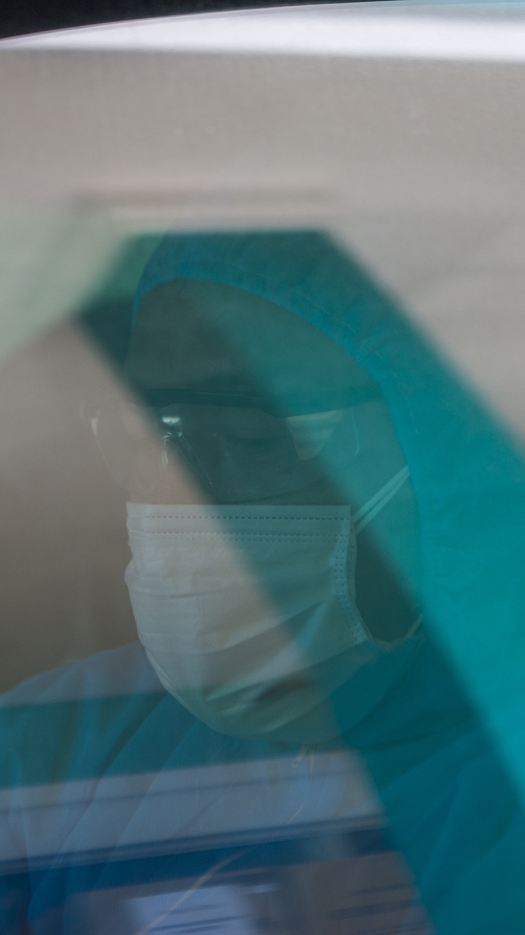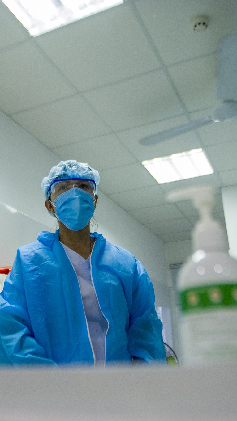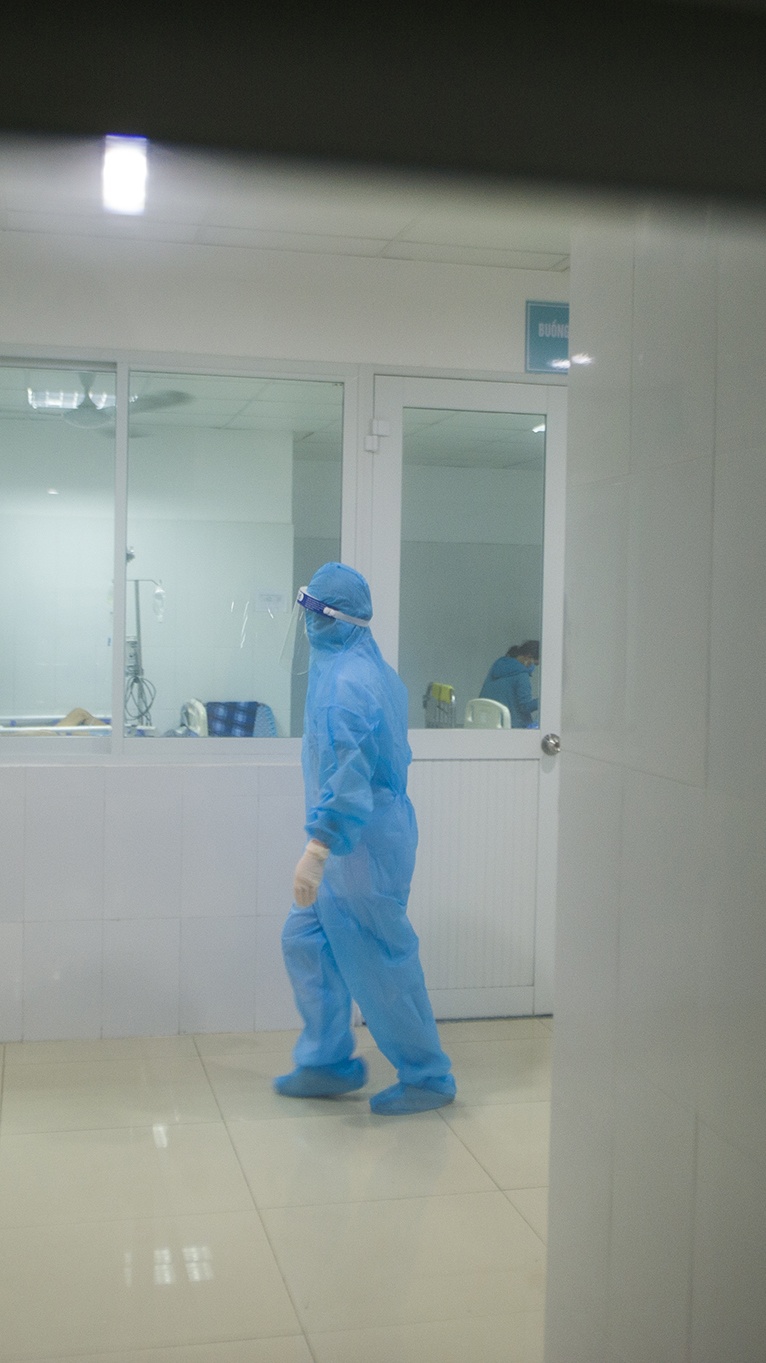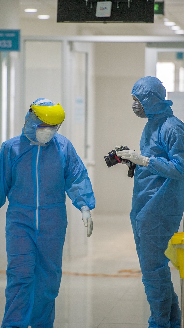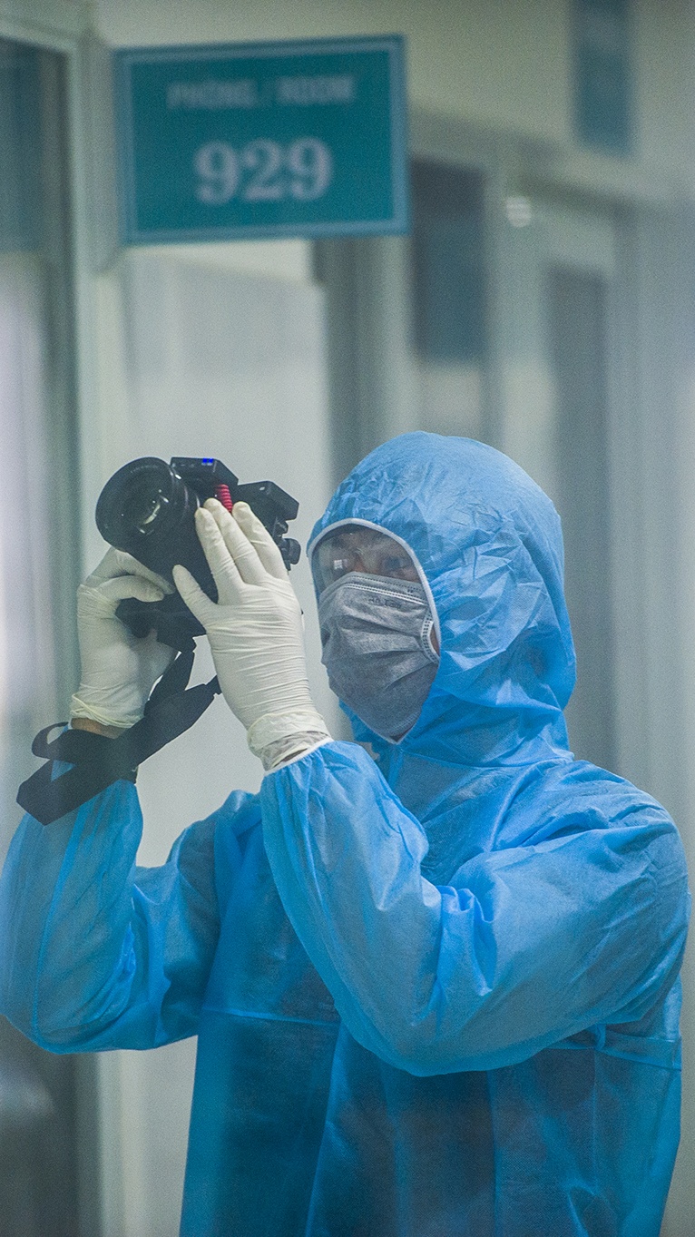 | Được cảnh báo nguy cơ khi tiếp xúc gần với các trường hợp F1, tôi cẩn trọng dùng trang phục bảo hộ, hạn chế cự ly khi tác nghiệp với các đối tượng có nguy cơ nhiễm bệnh cao. Tôi chọn giải pháp chụp ảnh qua kính ở hầu hết khung hình. |